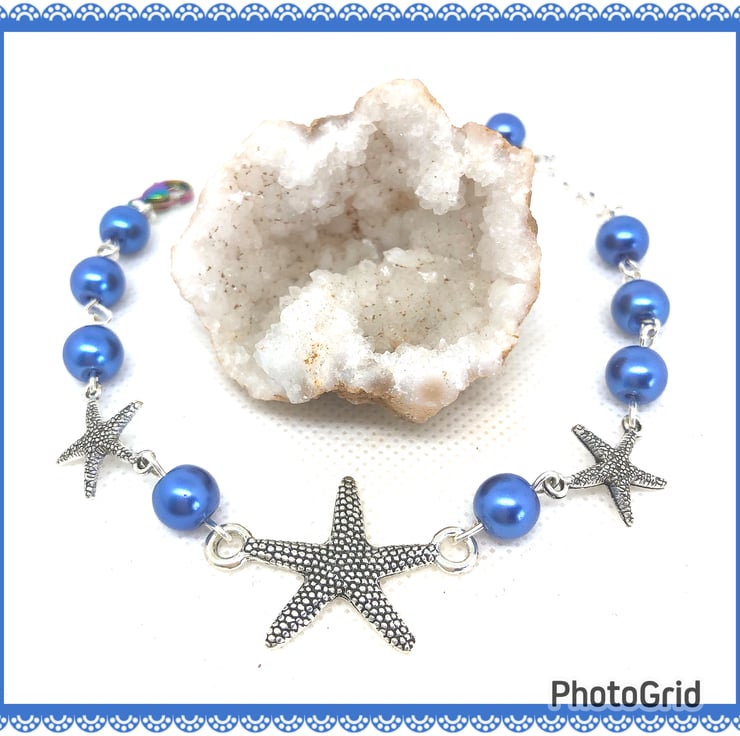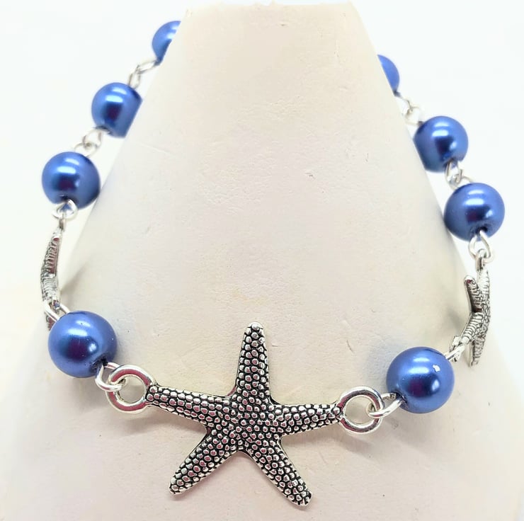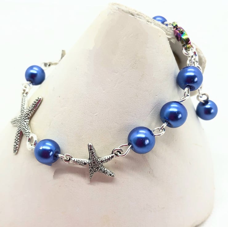 A starfish linked bracelet with faux pearls beads, Tibesilver starfish connectors finished with a rainbow trigger clasp & extension chain. Nickel free bracelet measures approximately 7 1/2”/19cm plus extension chain.