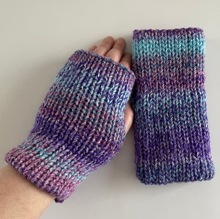 These fingerless gloves are double layered, so they will keep your hands warm and cosy. When you need to use your hands, simply place your thumb inside, pull them further down your arm and wear them as wrist warmers.