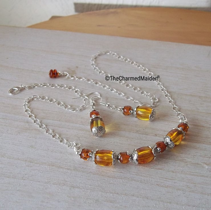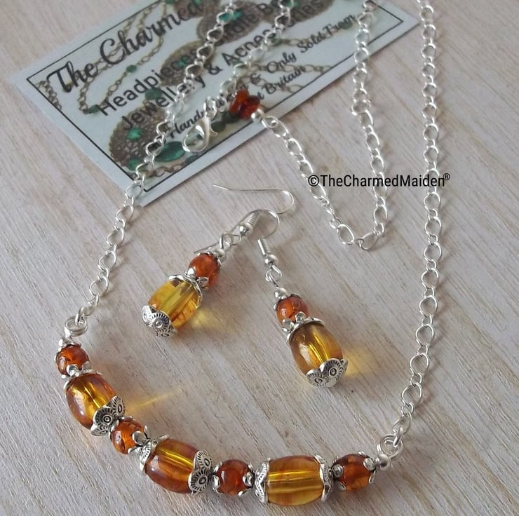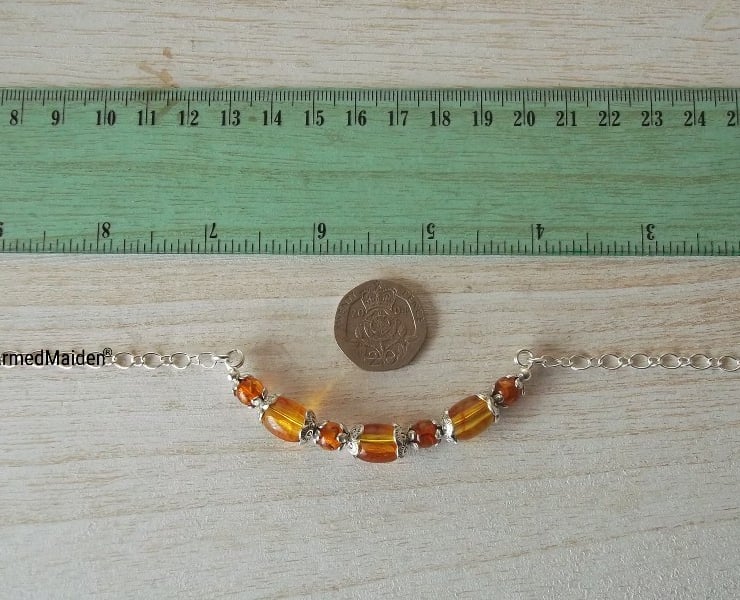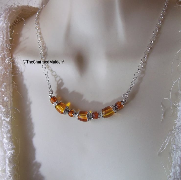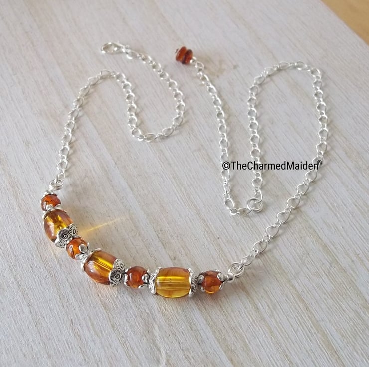 An eye-catching, beautifully beaded curved bar necklace of faux amber beads. This stunning piece has been created with alternating round resin & oval acrylic beads each framed with engraved & smooth petal styled Tibetan silver bead caps. A lovely mother & son soldered silver plated chain completes the look.