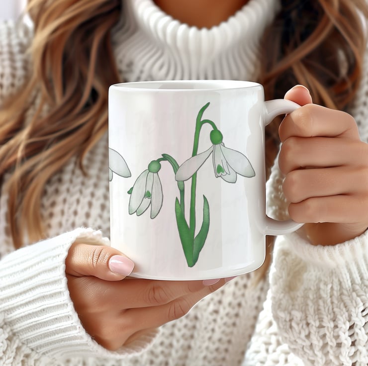 Snowdrops Mug - joyfully and uniquely hand drawn and then sent to be printed by a small family-owned business in the UK. Matching coaster also available.