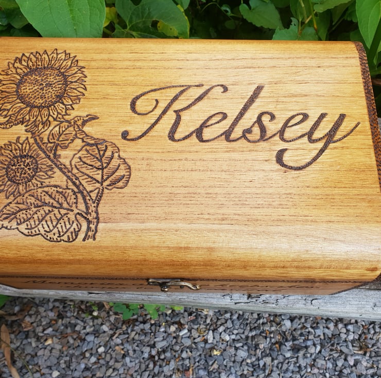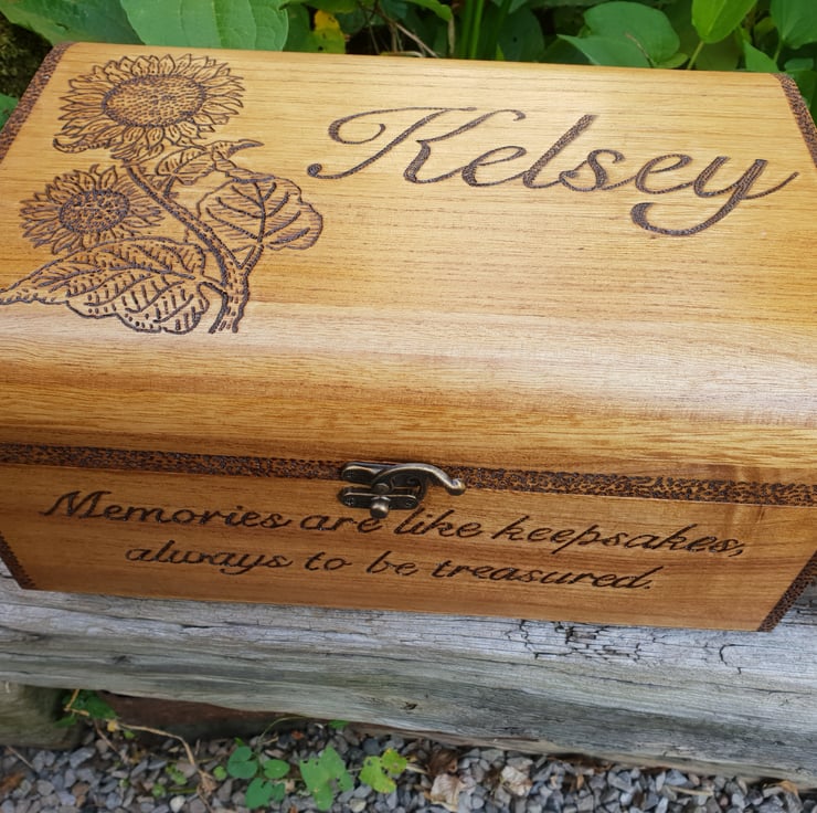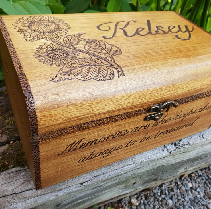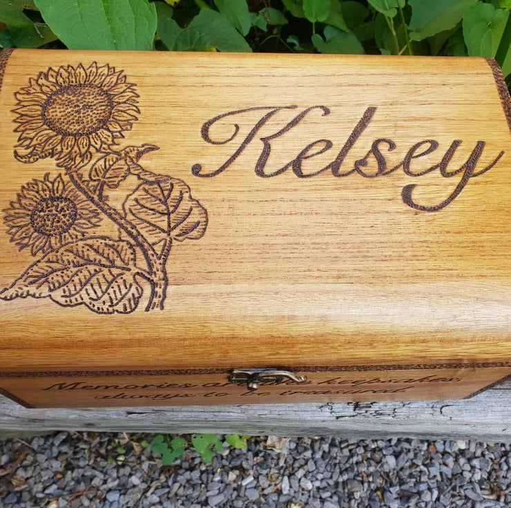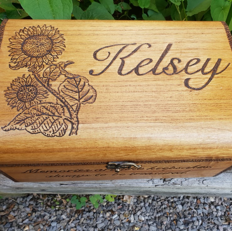 Beautiful wooden chest that would make a much cherished keepsake box. Let me know what name you would like added to the box and if you would like a different graphic