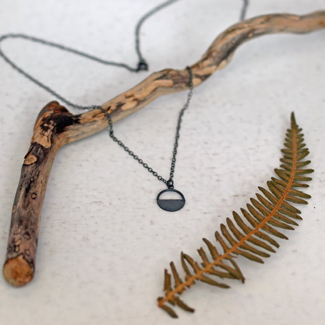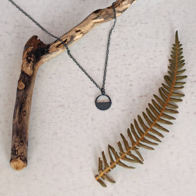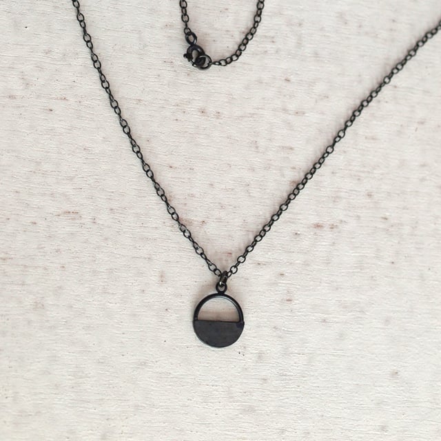 A semi-circle within a circle has been handmade from solid sterling silver sheet and wire. The chain is also solid sterling silver and the entire pendant necklace has been oxidised to a dark grey - black.