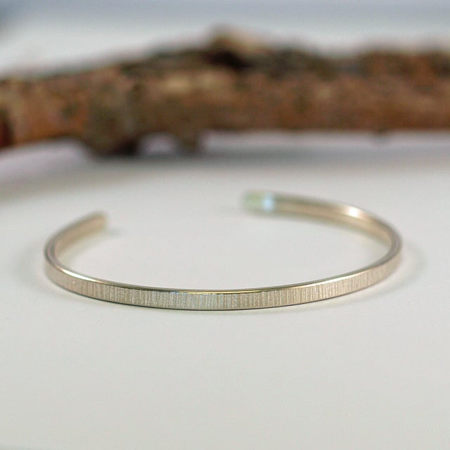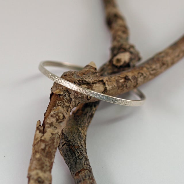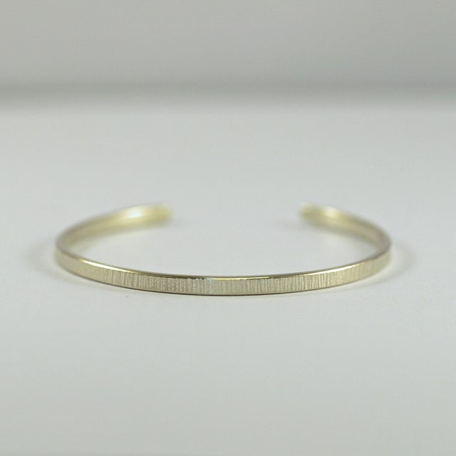A long strip of rectangular profile solid rectangular sterling silver wire, which has been hammered with the sharp edge of a hammer to create a line pattern all along the outside side of the cuff. The form of the cuff has been formed around a bangle mandrel.