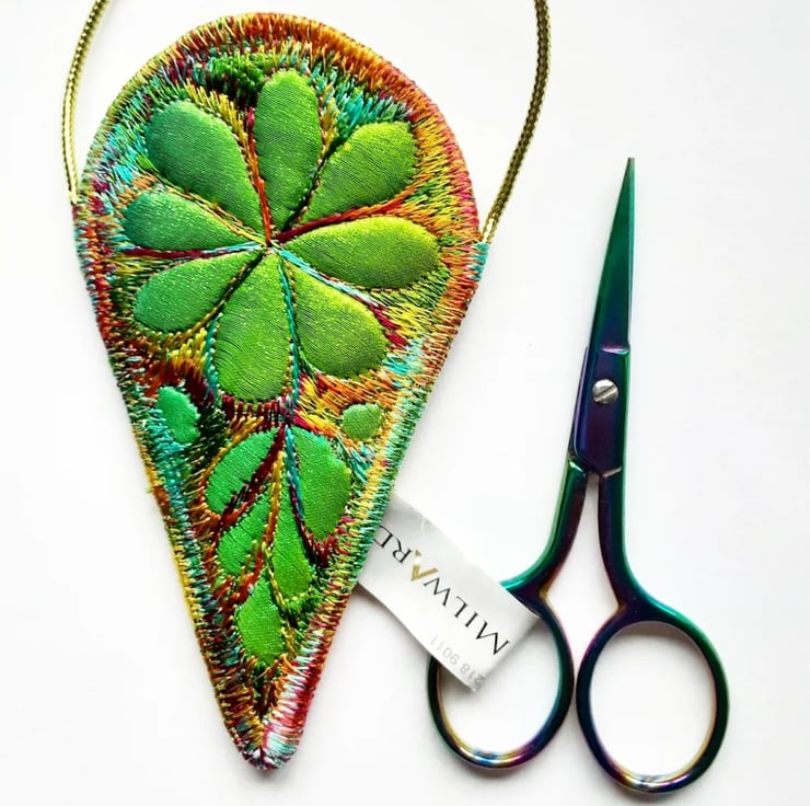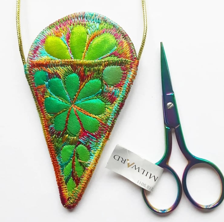 Size approximately 4.5" x 2.5" with a gold cord long enough to slip over your head and hang at a convenient length to grab your scissors when you need them.