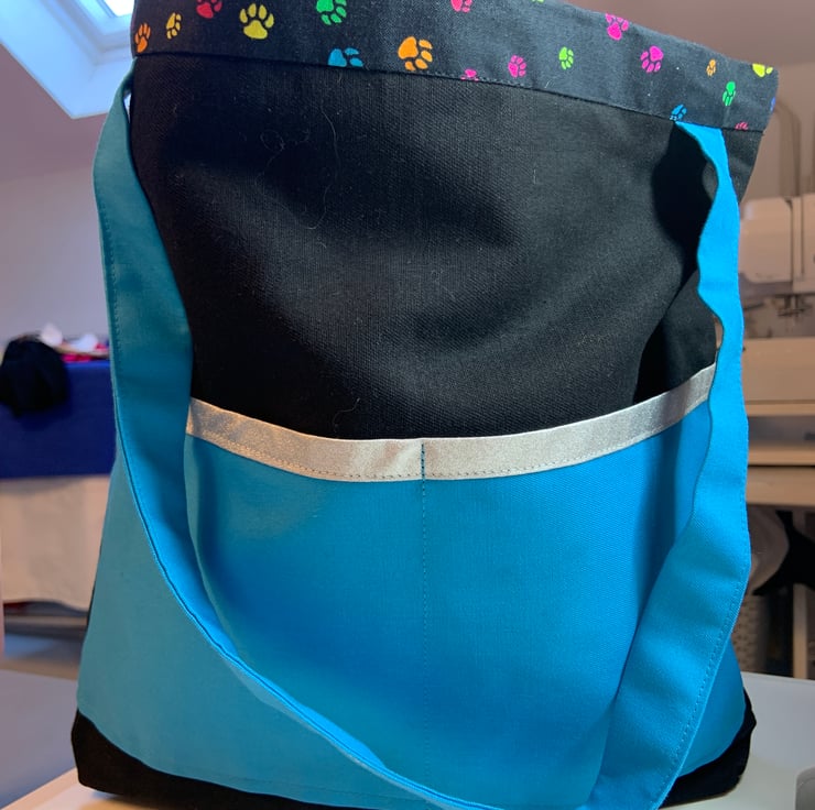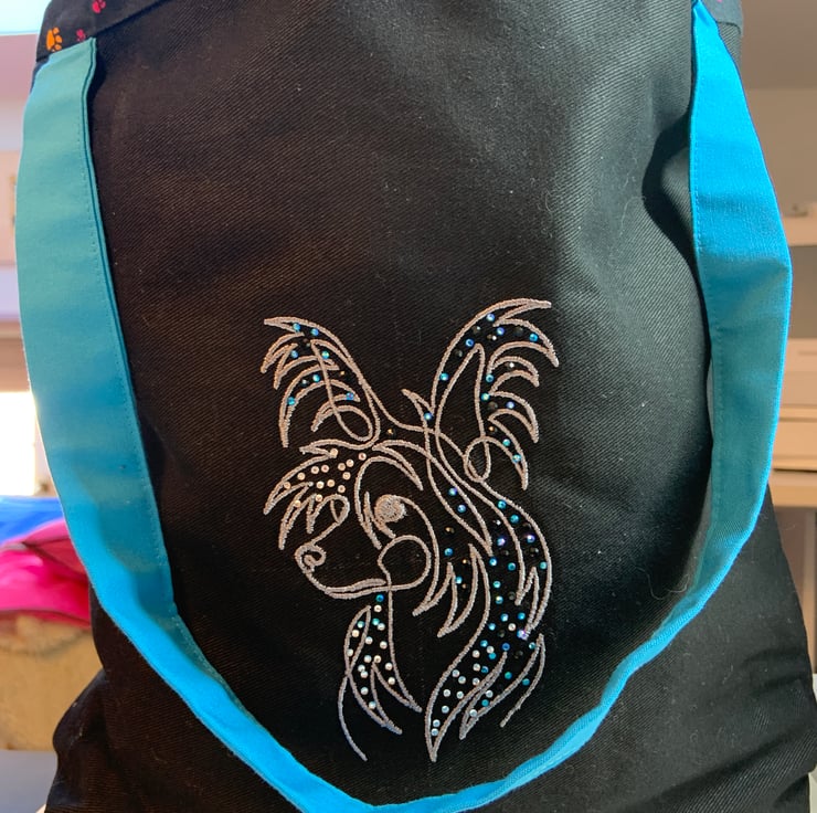 This is a lined tote bag made with a Chinese Crested dog line drawing style embroidery. This is an ancient breed which can charm you with intelligence and quirky natures. As part of my collection of dog breeds, I wanted to put this onto a multi coloured bag with a bit of bling and pizazz The lining is cotton and the outer bag is cotton twill. A couple little extra exterior pockets for smaller items are also useful. The bag measures about 14 inches on the main compartment. The colours of black turquoise and a touch of silver trim look quite smart. This could be a fab wee book bag, small shopper or maybe a craft project bag.