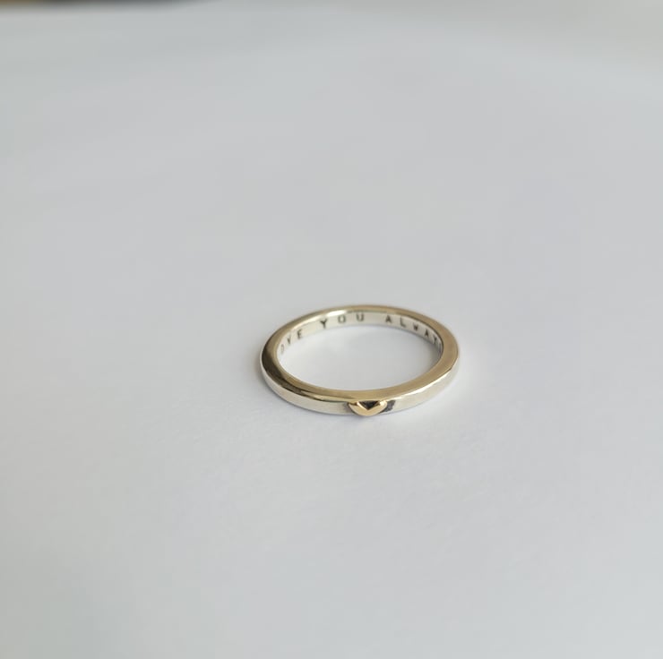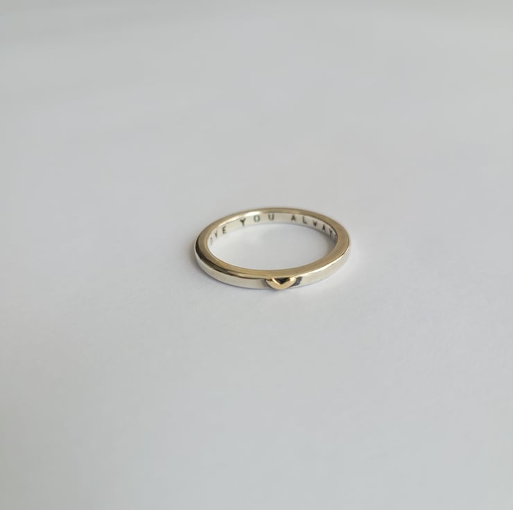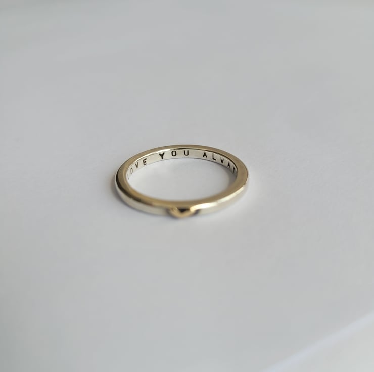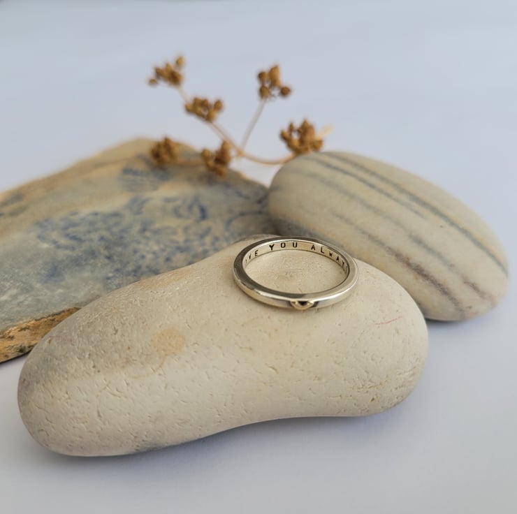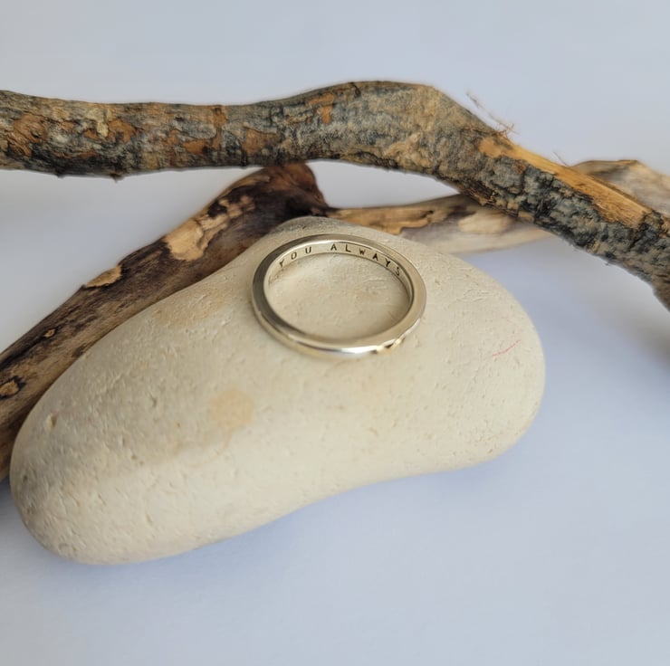The message inside the ring on the photograph reads 'LOVE YOU ALWAYS' this can be changed to a message or date of your choice, or name and date, initials, numbers, or heart stamp. Only capital letters are available for this width of ring.