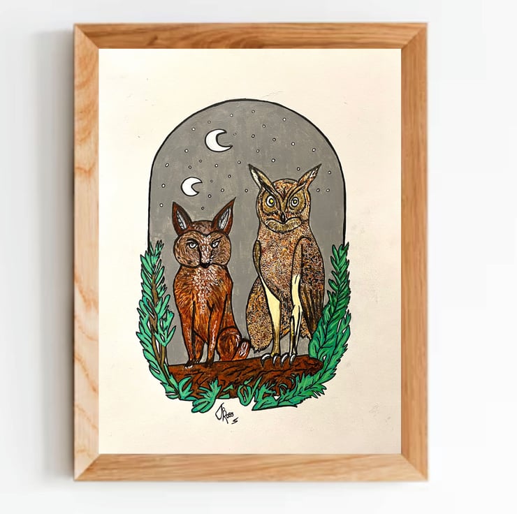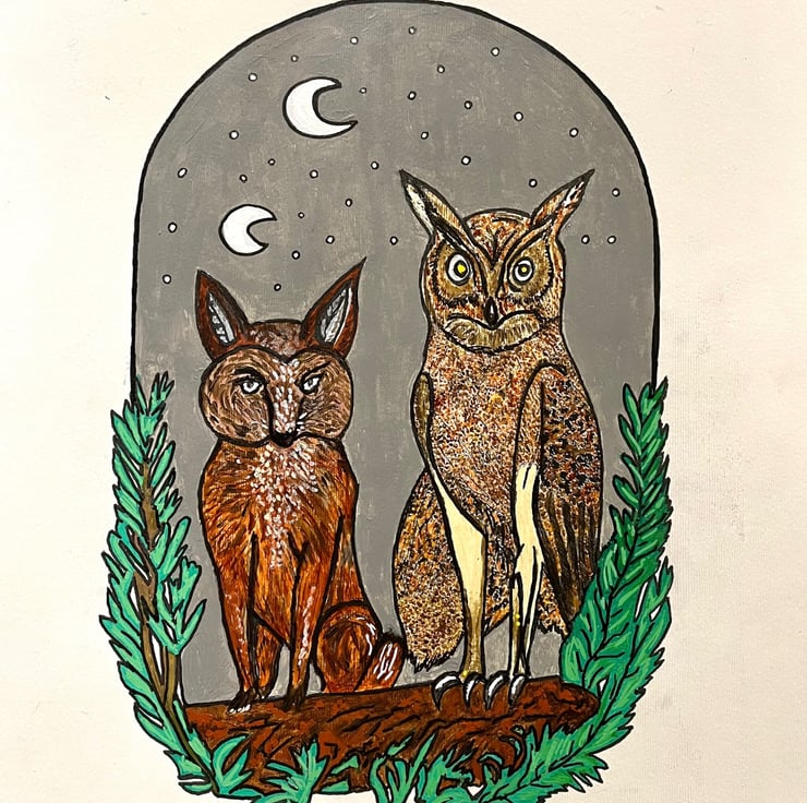 An illustration of the Fox and The Owl, created with acrylic paints and Archival Fine liners.