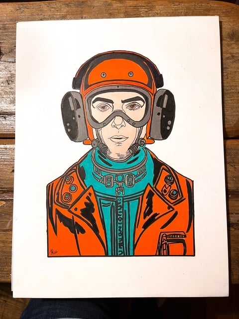 An illustration of a futuristic female dressed in her Cyborg Suit, created with acrylic paints and Archival Fine liners.