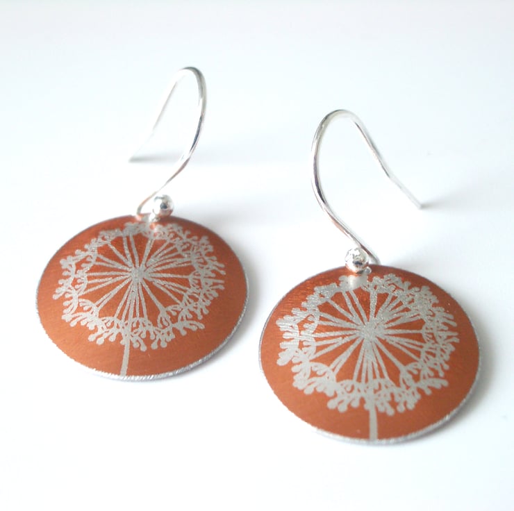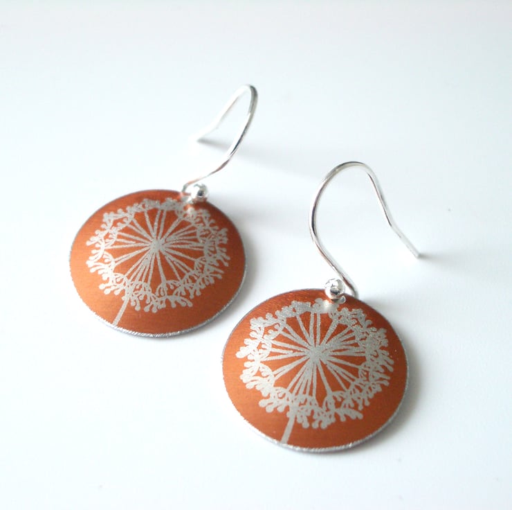 These simple earrings are made from aluminium which I have dyed orange and printed with a single silver dandelion clock which contrasts nicely with the orange.