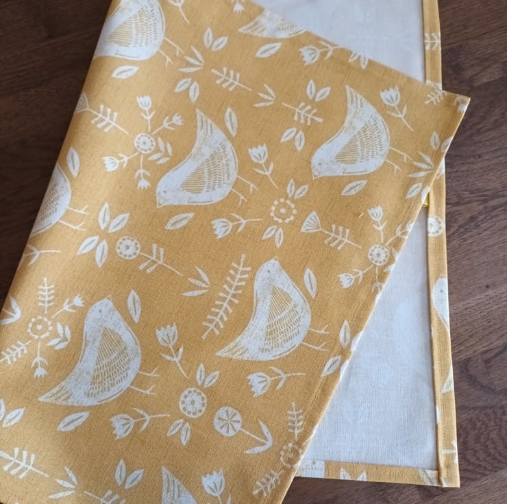 Scandi style tea towel yellow ochre, with grosgrain ribbon hanging loop. 100% cotton. Wash on a warm/cool cycle and warm or cotton setting iron.
