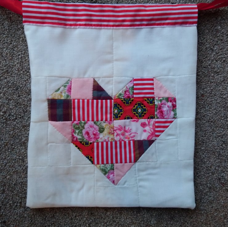 Beautiful little drawstring bag, available in red and white or purple, featuring a heart in handsewn patchwork. Perfect for a Valentines day gift, or for an Engagement. Wedding or Anniversary present, either as a gift in itself or a gift bag in which to put jewellery or another small item.