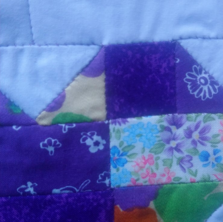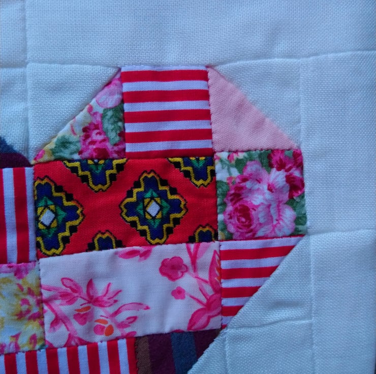 The front of the bag is in handsewn patchwork made up of a heart in random fabrics with a choice of a red and pink colour scheme, and a background of a white slightly open weave fabric. Or of purple patchwork with a plain lilac cotton background.