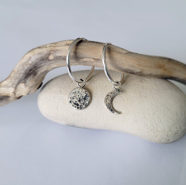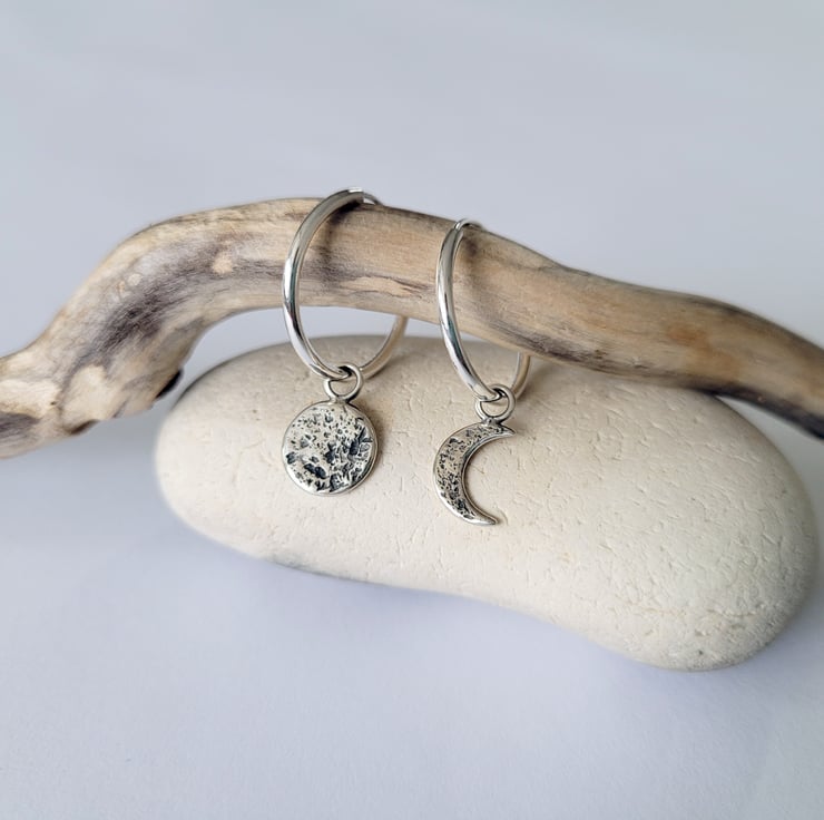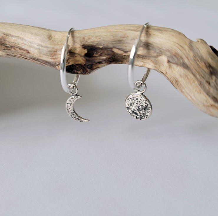 A tiny full moon and tiny crescent moon have been handmade from recycled sterling silver and given a texture formed by hammering the silver against concrete. The 'craters' of the moons have been oxidised to create a more lunar like look.