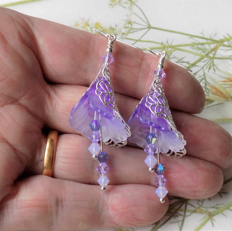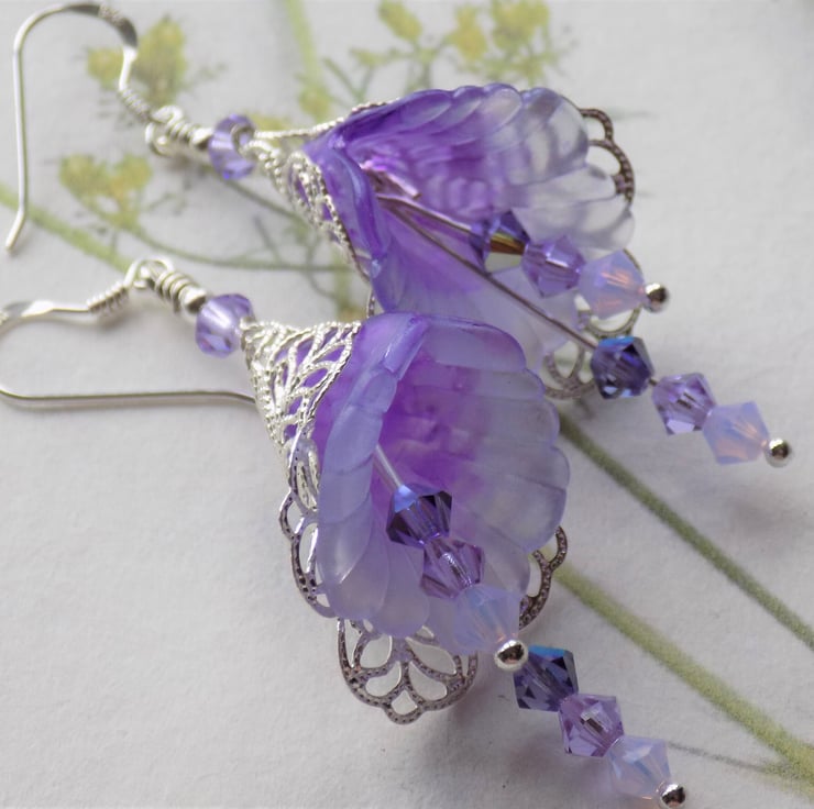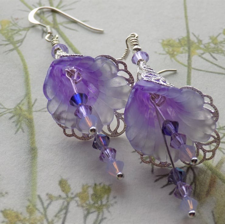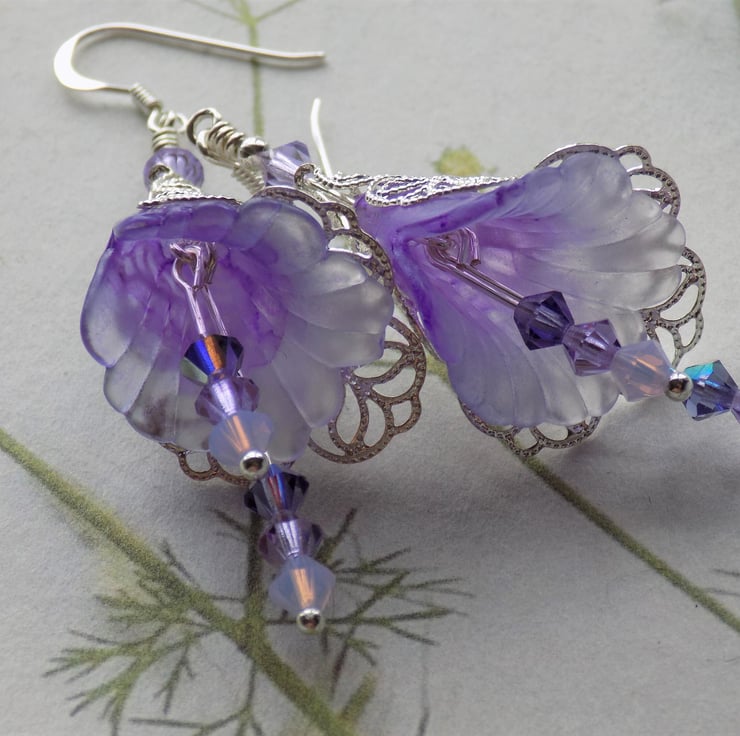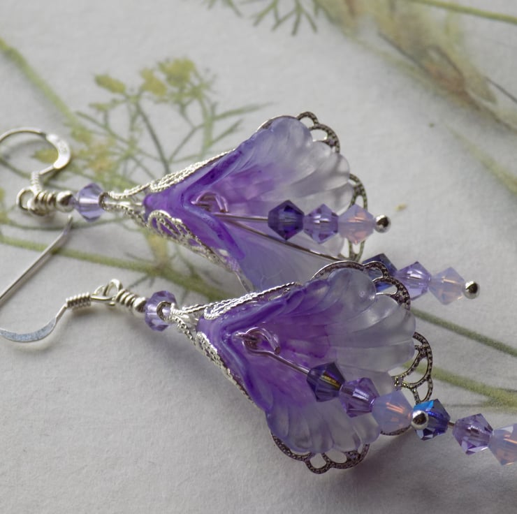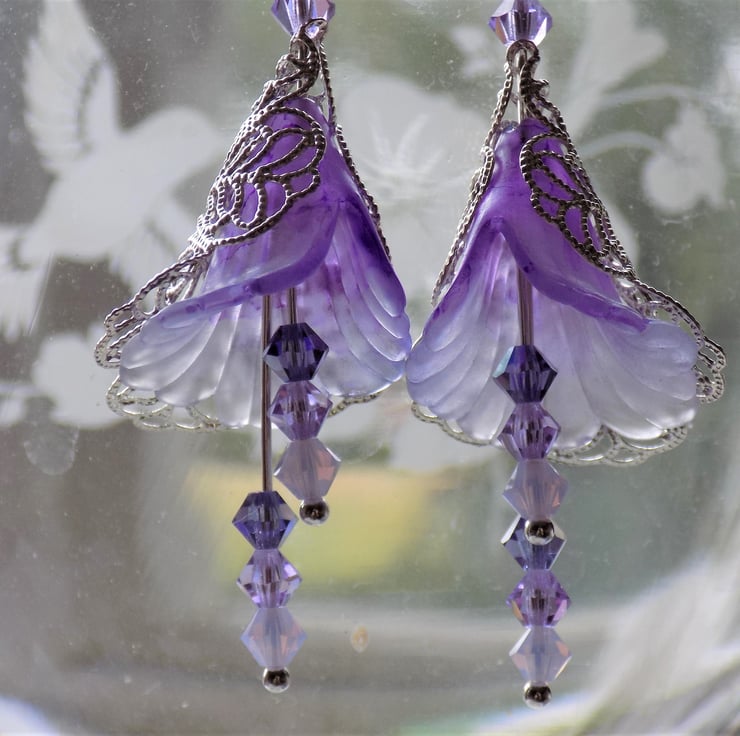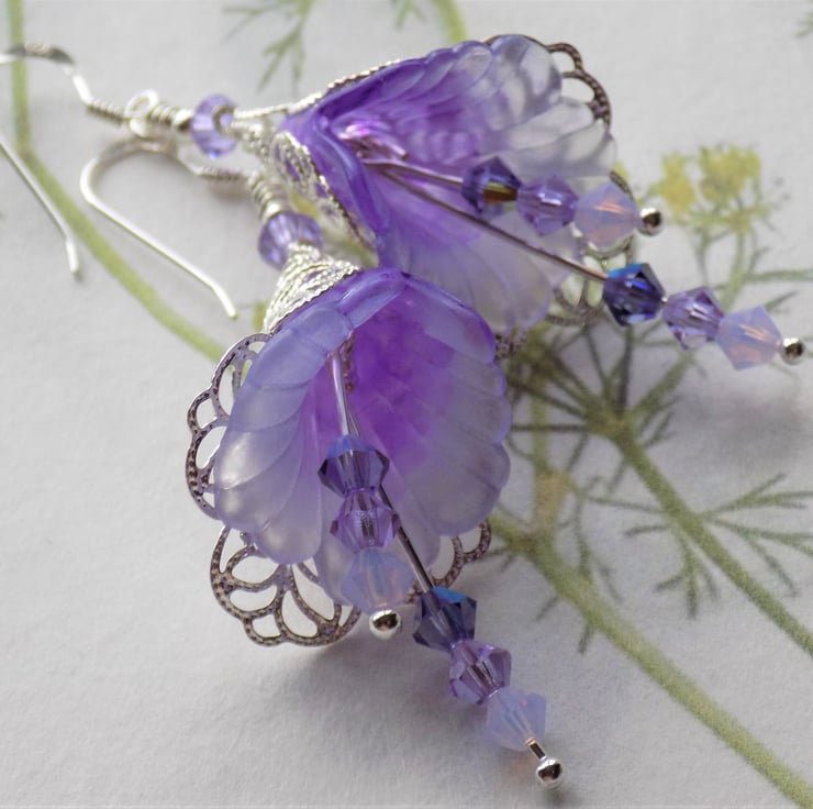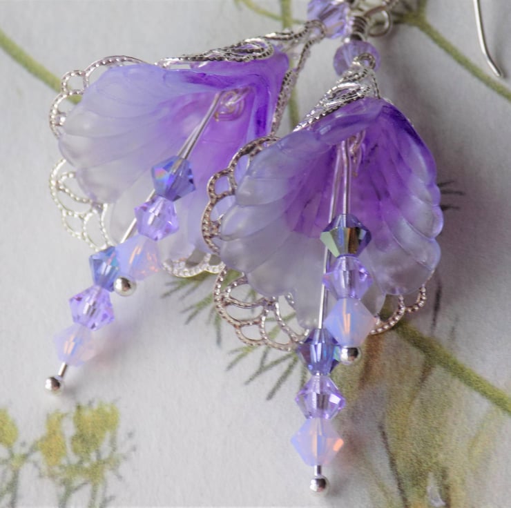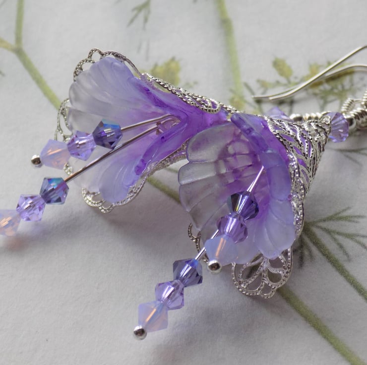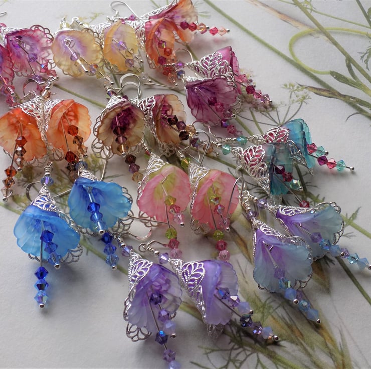 Inspired by some beautiful shades of phlox and comos, in flower at the moment, these lucite lily flowers are hand painted in gorgeous glowing translucent colours and surrounded by lacy filigree silver. They have dangles of three different shades of Swarovski crystals, chosen carefully to tone perfectly with the flower colours.