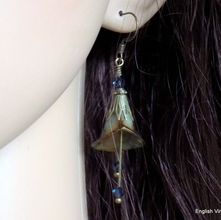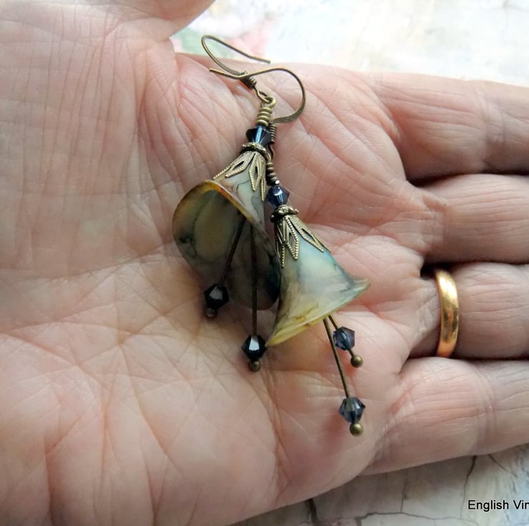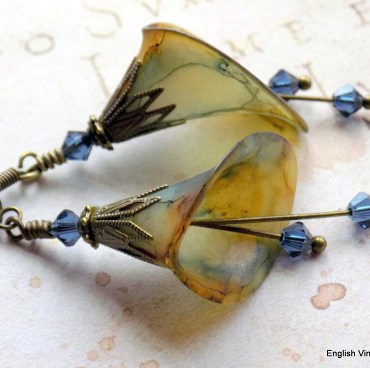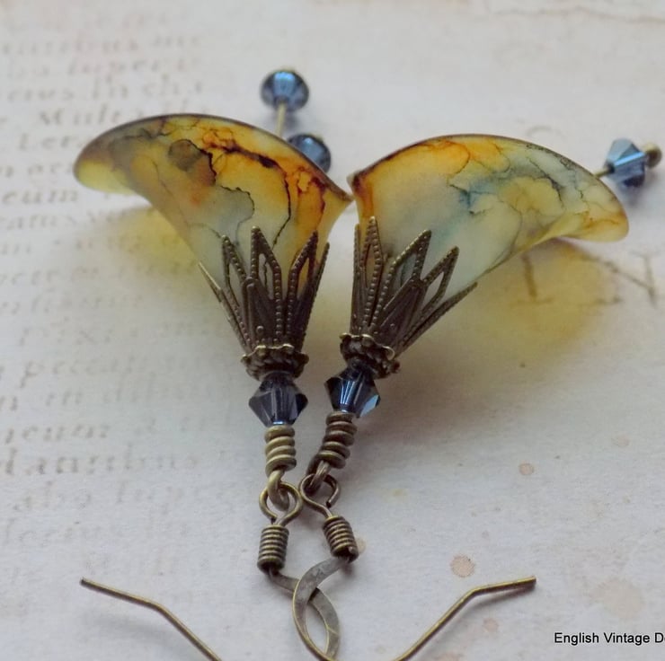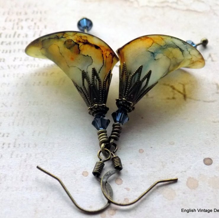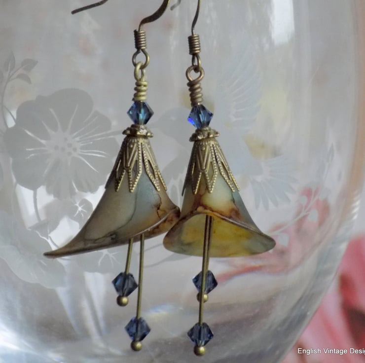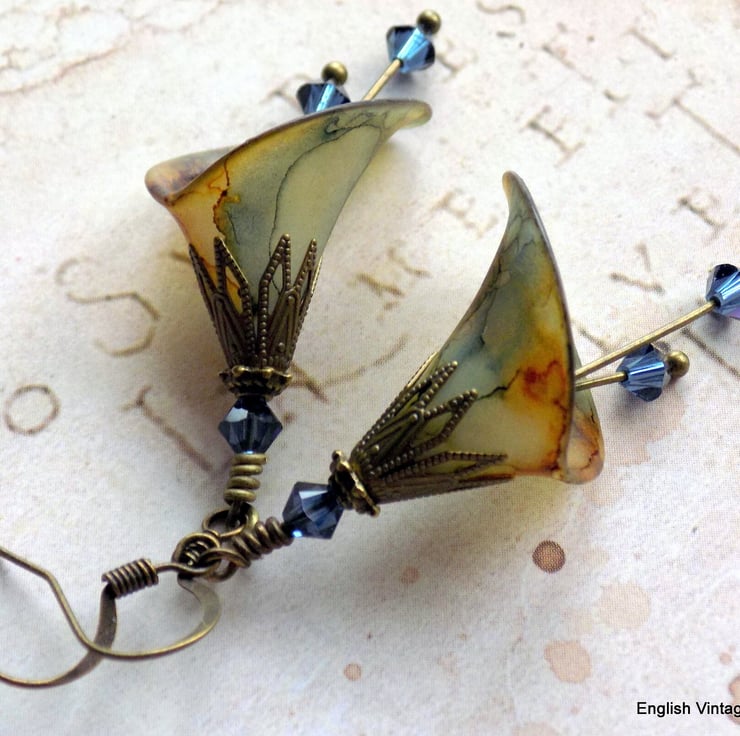 Hand Painted Lucite Flower Earrings, exclusive to English Vintage Design, in a gorgeous blend of coffee and denim and featuring Swarovski Crystals and filigree brass bead caps. They are pictured with hooks but you may choose your desired ear wire from the drop-down menu.