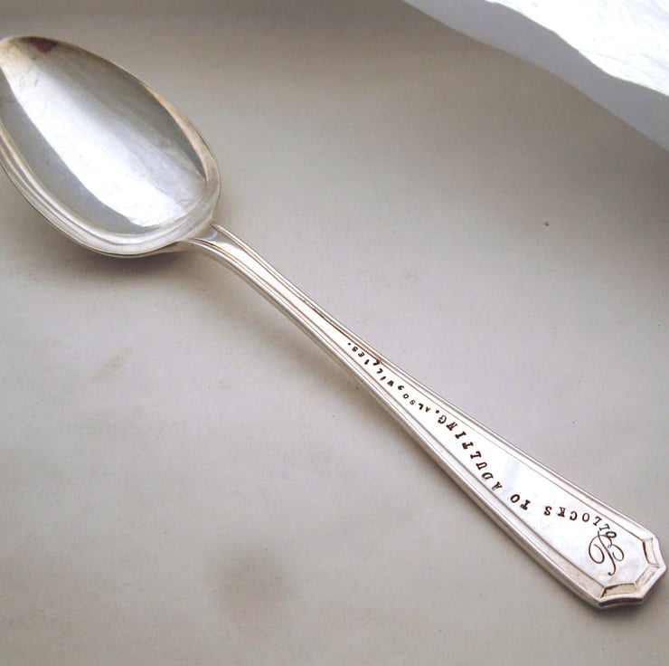 A rude tablespoon for anyone who'd rather act their shoe size than their age. It's a vintage silverplate spoon approx. 21cm long and I've added to the elegant 'B' monogram on the handle by handstamping it with some very inelegant wording, so it now reads 'B-LL-CKS TO ADULTING. ALSO, W-LLIES.'