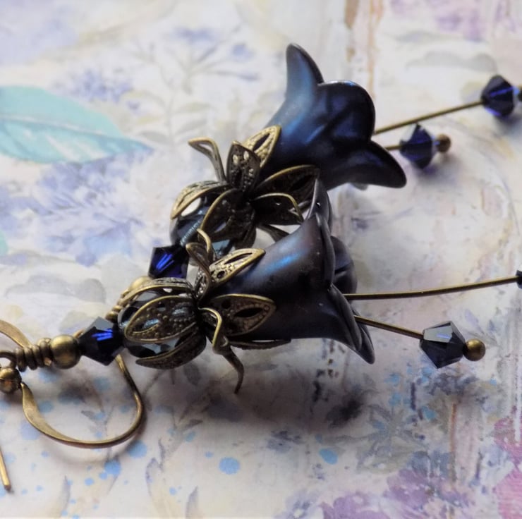 'INDIGO' is exclusive to English Vintage Design; these lovely earrings feature my smaller lucite bell flowers in deepest blue and featuring antiqued bronze, double filigree bead caps and stamens of swarovski crystals in Indigo Blue.