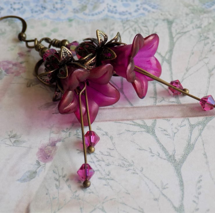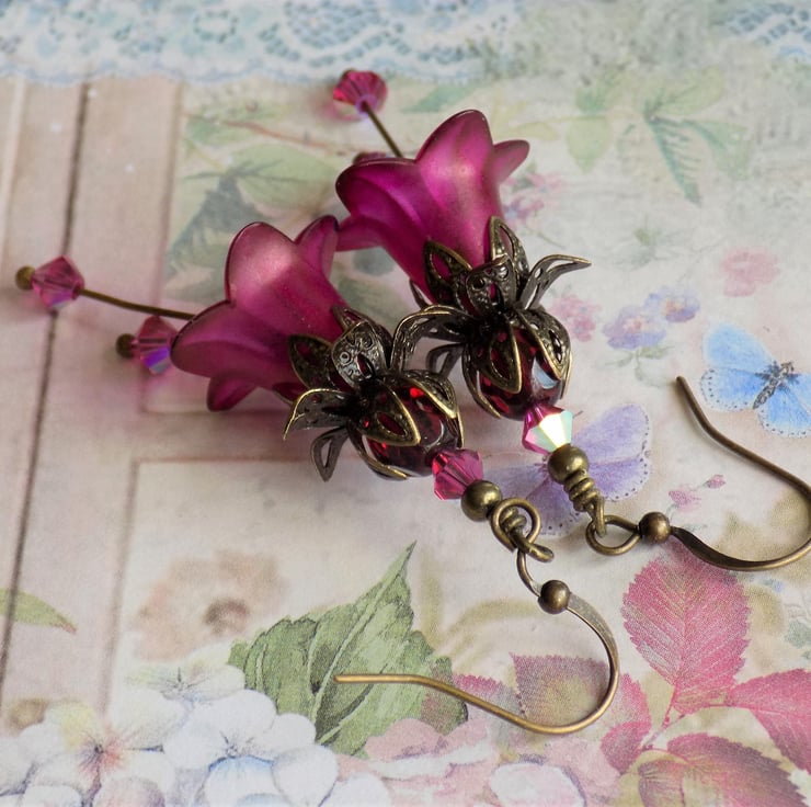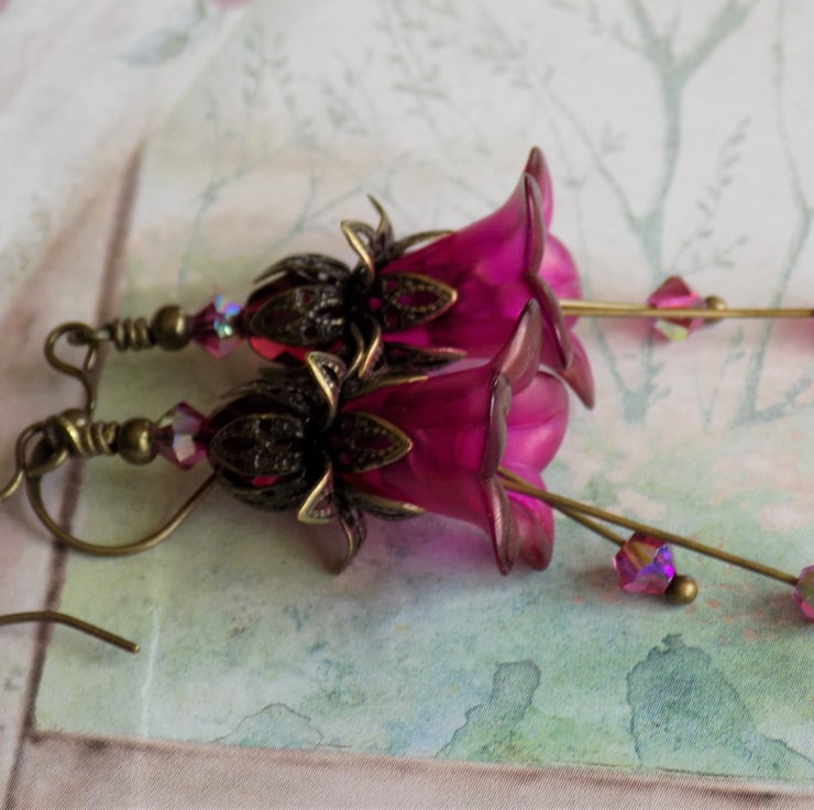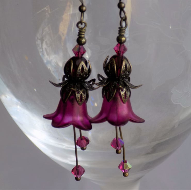 'WILD PLUM' is exclusive to English Vintage Design; these lovely earrings feature my smaller lucite bell flowers in glowing plummy fuchsia pink and featuring antiqued bronze, double filigree bead caps and stamens of swarovski crystals in Fuchsia AB. They really are very cute and extremely lightweight to wear.