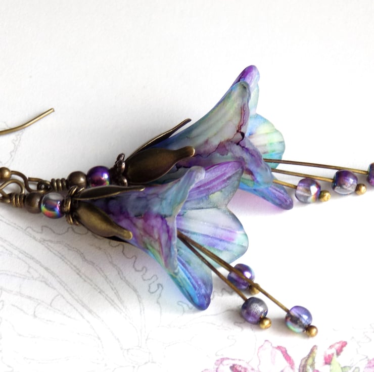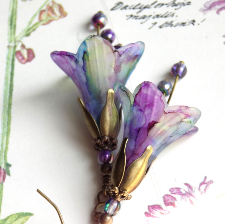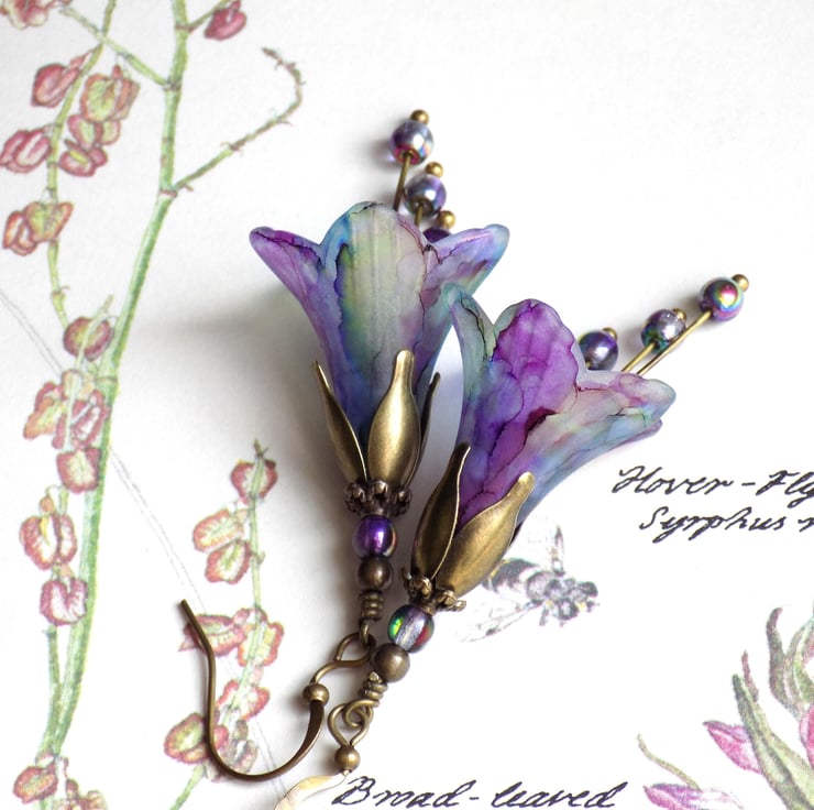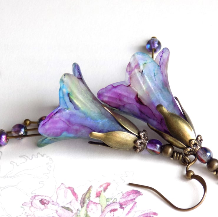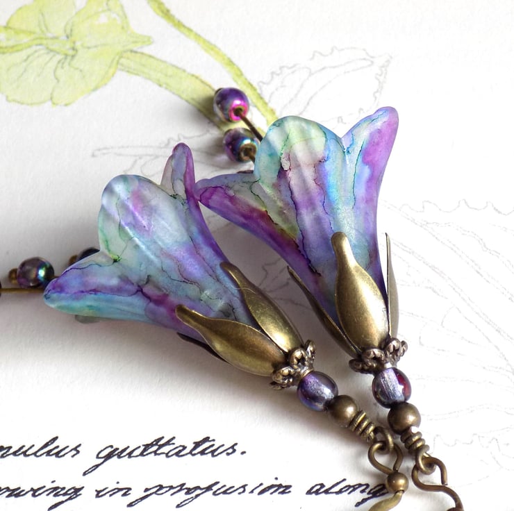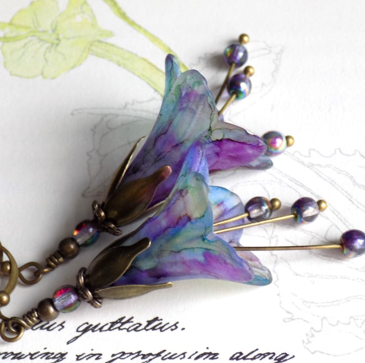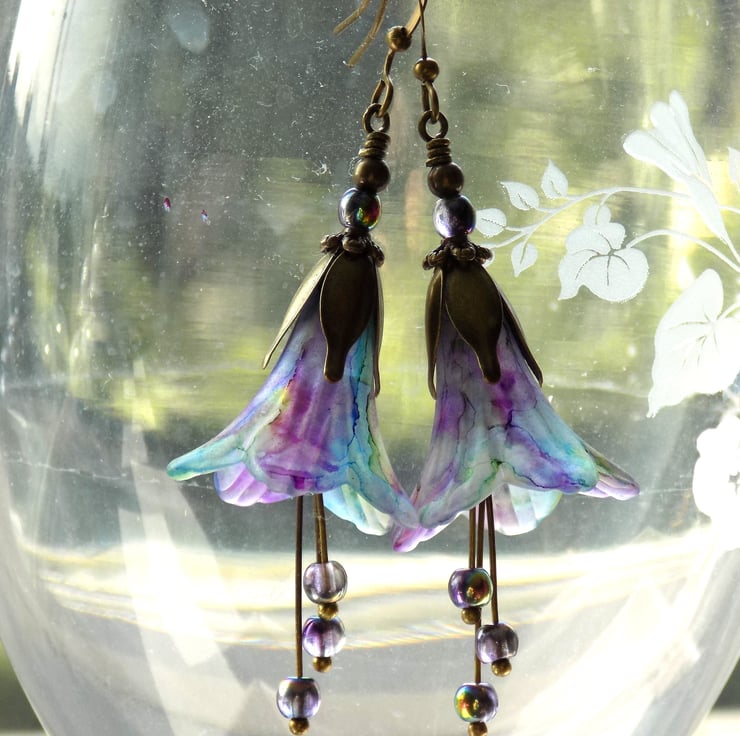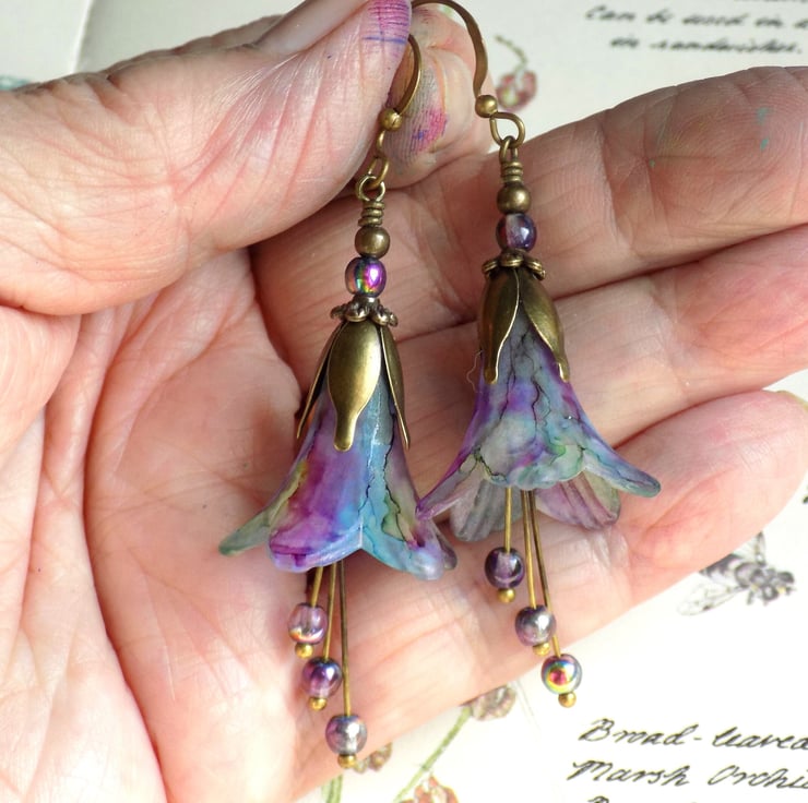 Beautiful hand painted earrings in a translucent blend of purple, blue, and green, unique to English Vintage Design. They feature three dangles of iridescent Magic Purple Czech glass rounds, which echo the flower colours perfectly. These are repeated above the bronze bead caps.