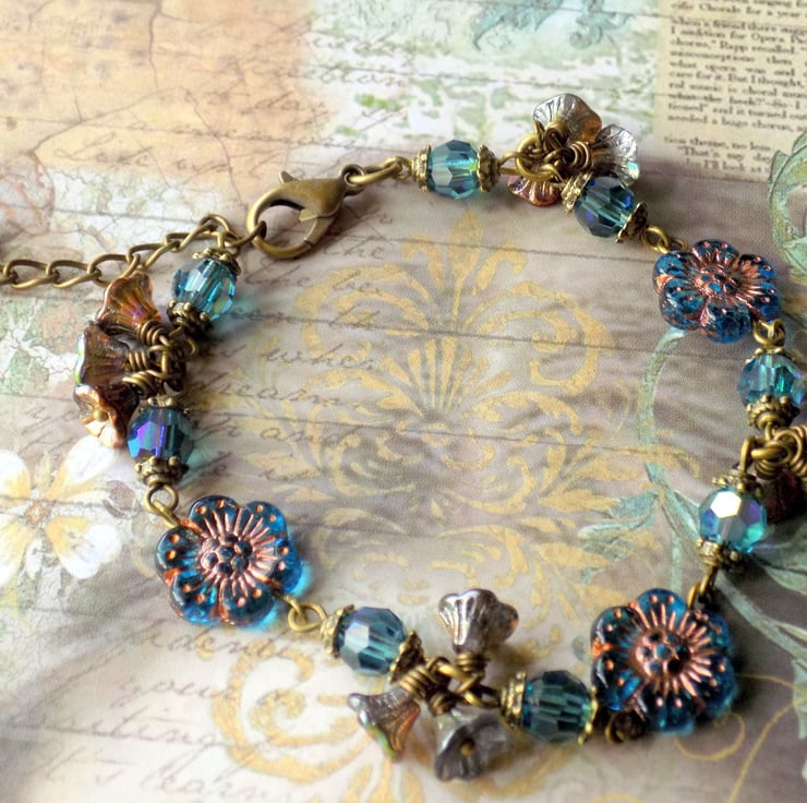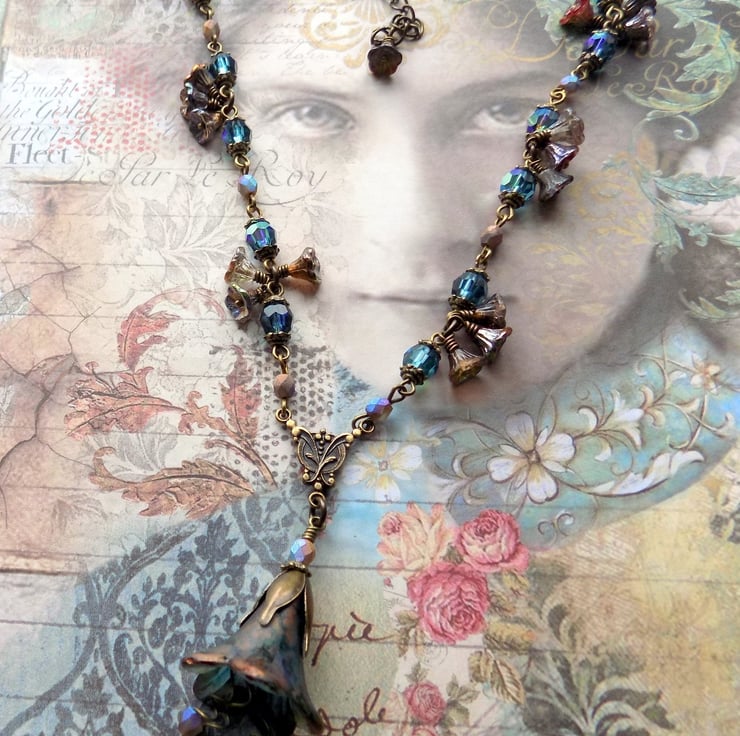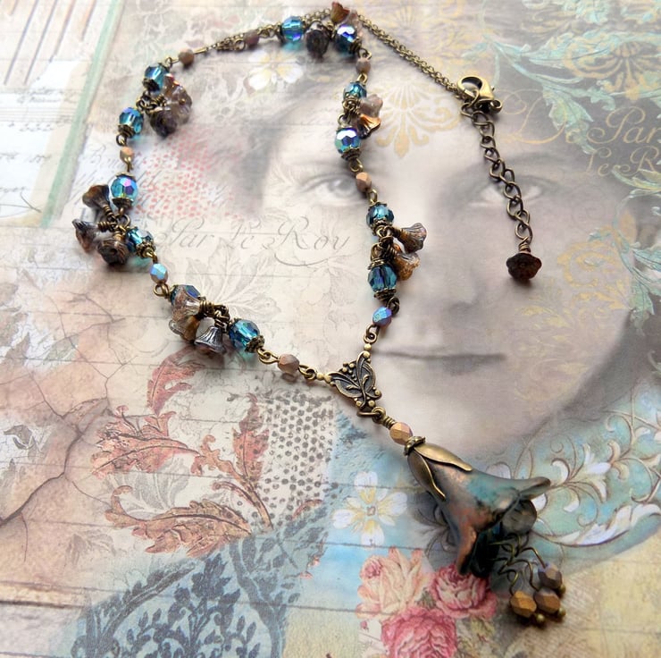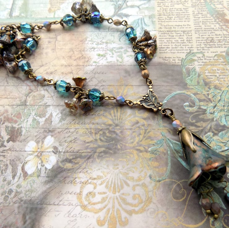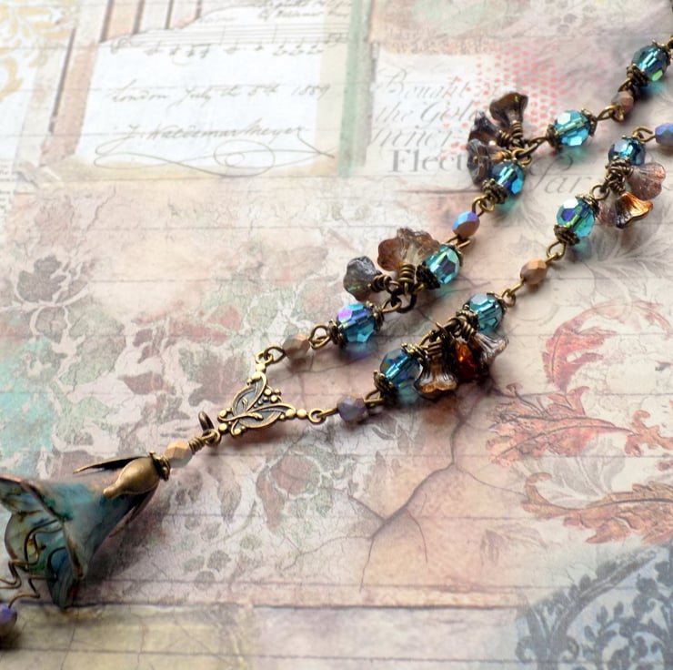 Hand Painted Lucite, Copper and Blue Flower Necklace, exclusive to English Vintage Design, featuring a large flower pendant with hand twisted stamens, Czech Glass beads, and antiqued brass bead caps. This necklace matches my Copper and Blue Earrings in this range.(see link below). The necklace is made from Swarovski crystal rounds and Czech glass rounds and flowers. It has a lobster clasp fastener and a extender chain with a flower.