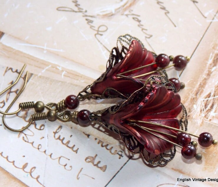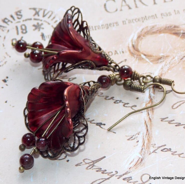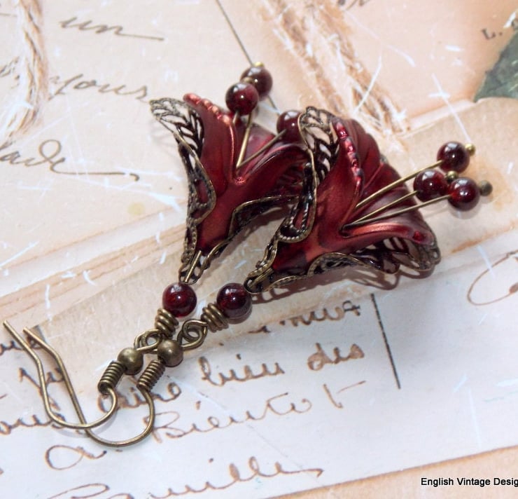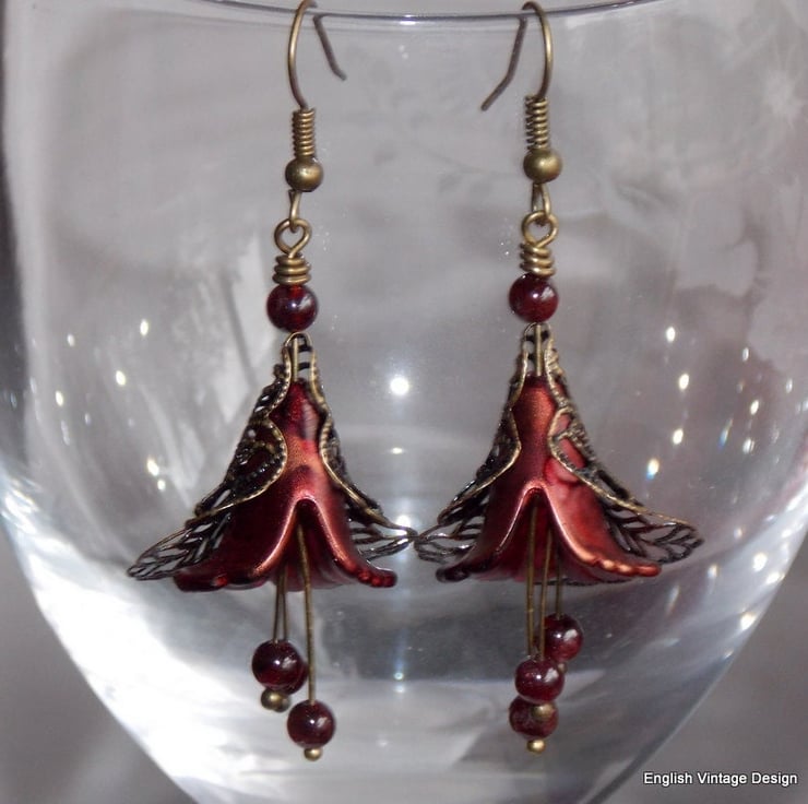 These are my medium lily flower range, with stamens of real garnet rounds and surrounded by beautiful bronze lacy, filigree wraps, extremely elegant and lightweight to wear.