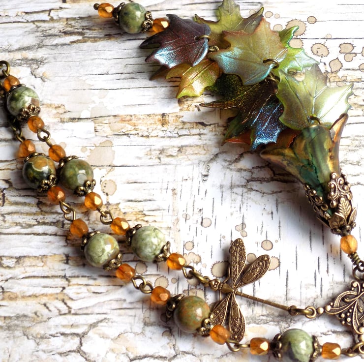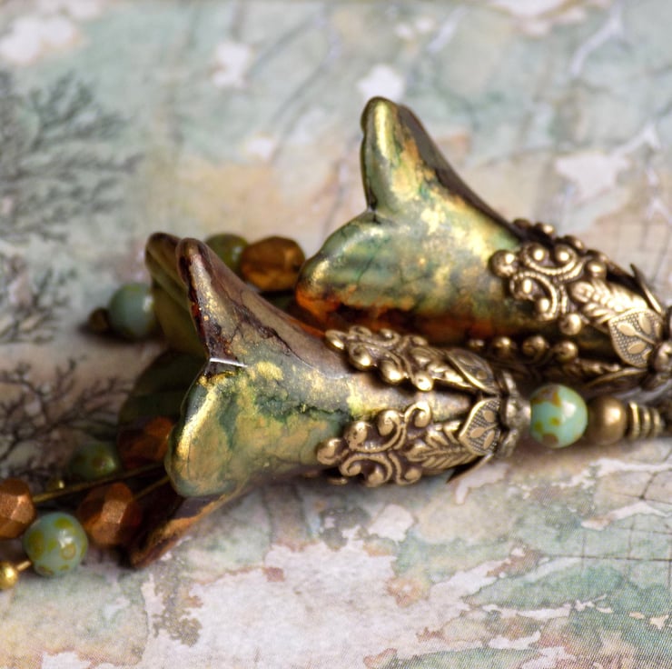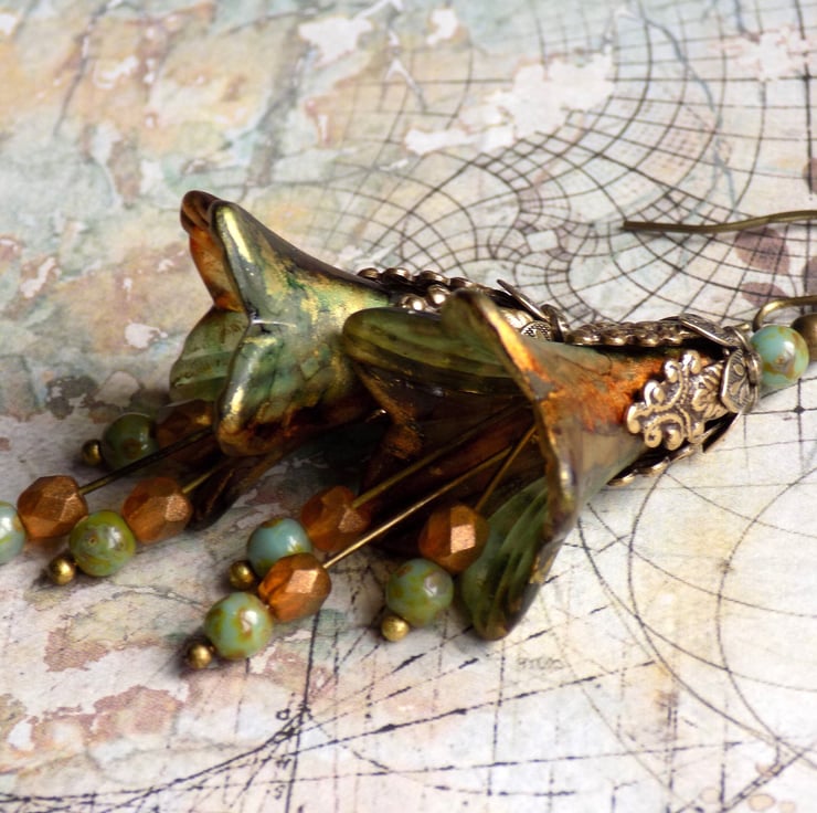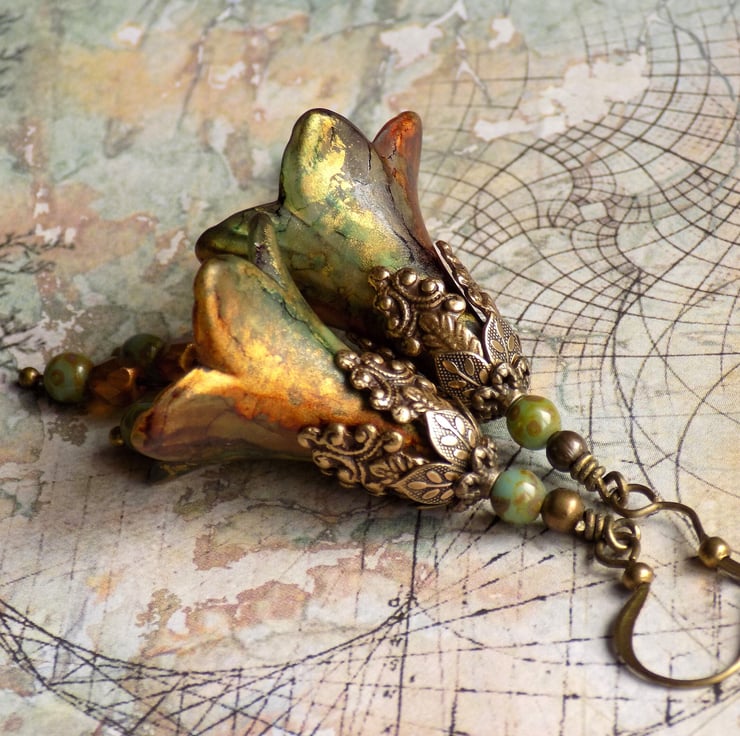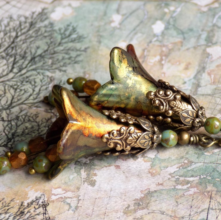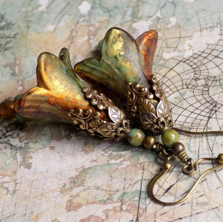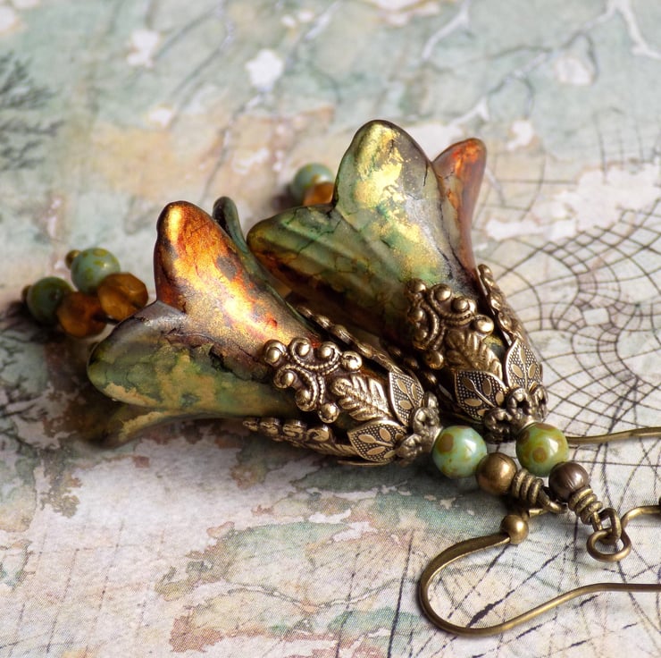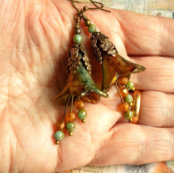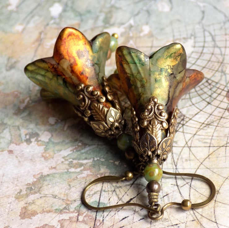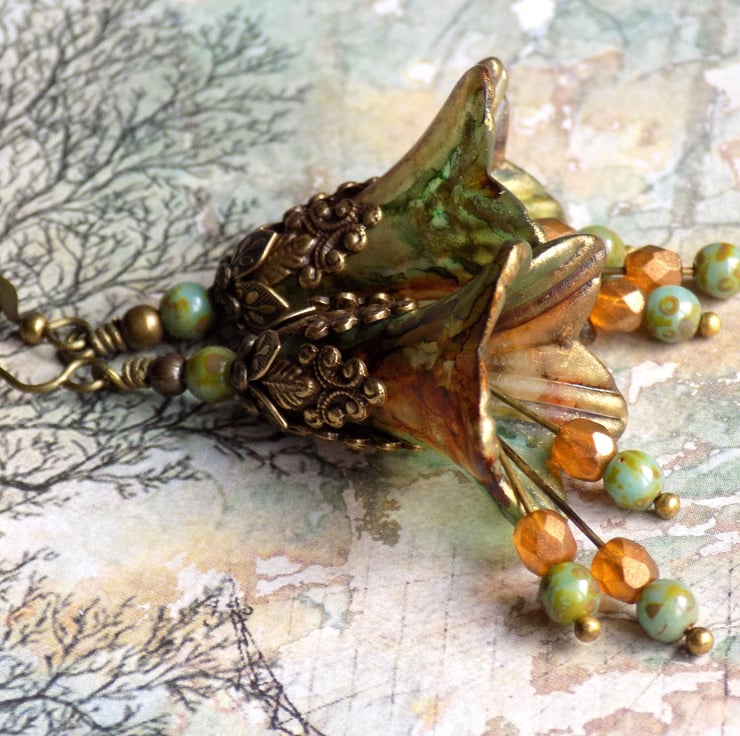 These gorgeous glowing autumnal earrings, match the beautiful leaf necklace I have listed in my shop (see last pic & link below). The large lucite hand painted flowers are in green, rust and gold, topped with elegant antique brass bead caps, and stamens of toning Czech glass beads, dangle from within the flowers.