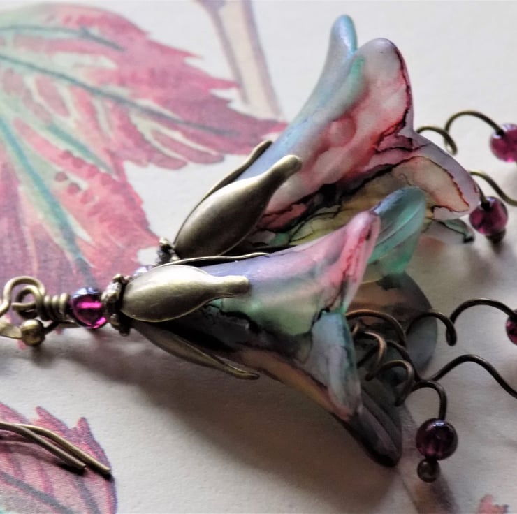 'Rowan' are one of 7 new autumn themed earrings exclusive to English Vintage Design; these lovely earrings feature my larger lucite bell flowers in a blend of greens, red, and a touch of brown, representing the autumn leaves and fruits of the rowan tree. Three hand twisted 'stamens' dangle below, with real garnet rounds, which also sit above the antique bronze bead caps.