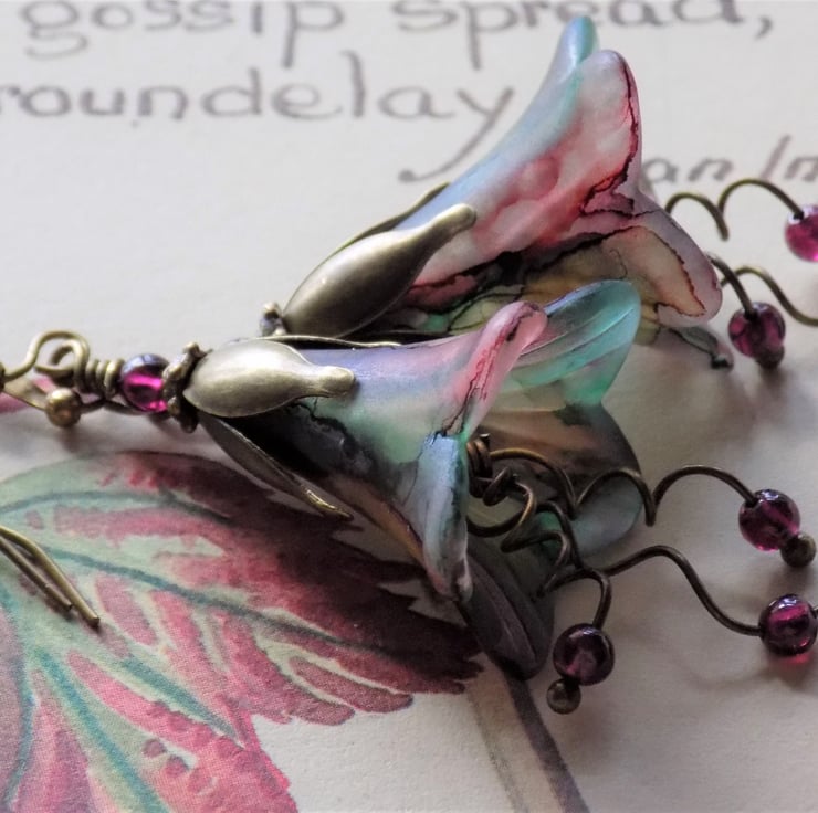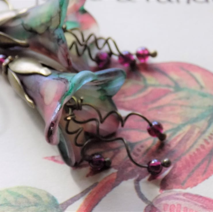 'Rowan' are one of 7 new autumn themed earrings exclusive to English Vintage Design; these lovely earrings feature my larger lucite bell flowers in a blend of greens, red, and a touch of brown, representing the autumn leaves and fruits of the rowan tree. Three hand twisted 'stamens' dangle below, with real garnet rounds, which also sit above the antique bronze bead caps.