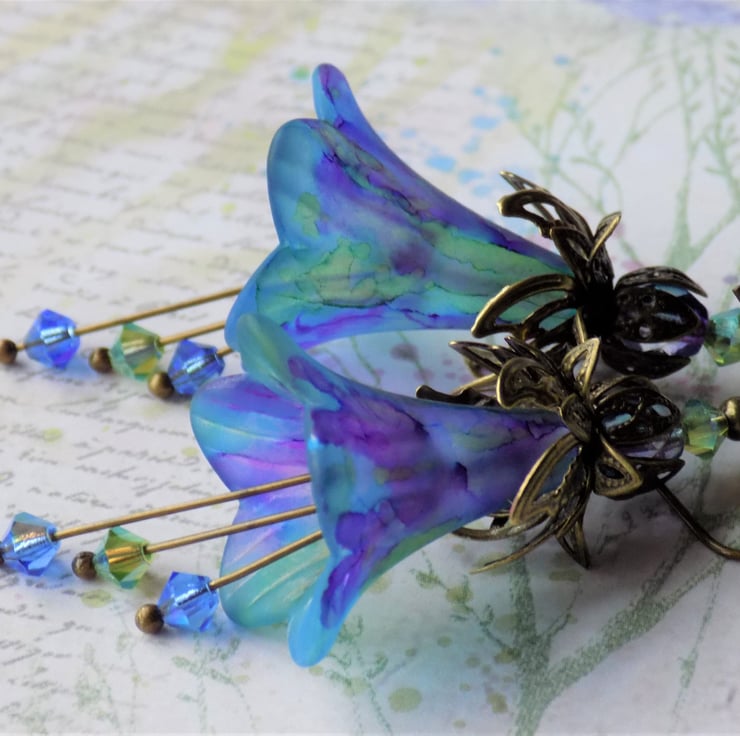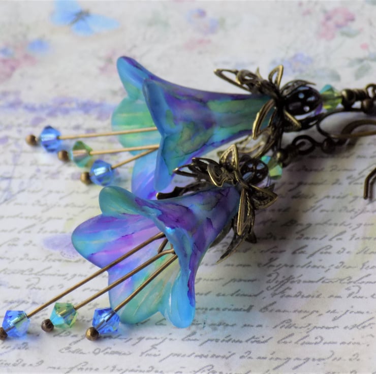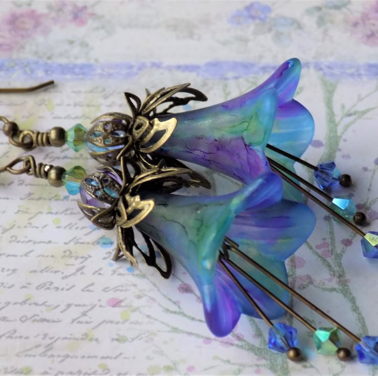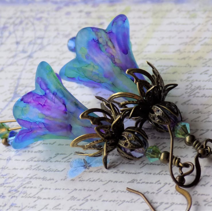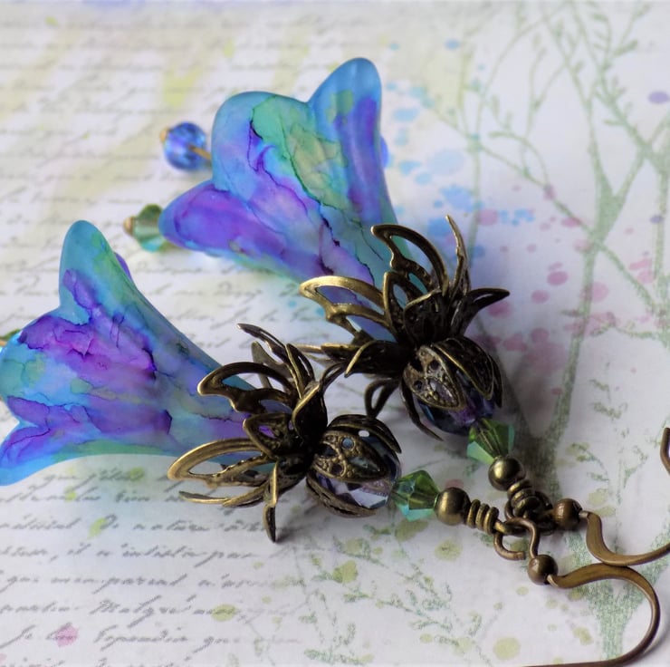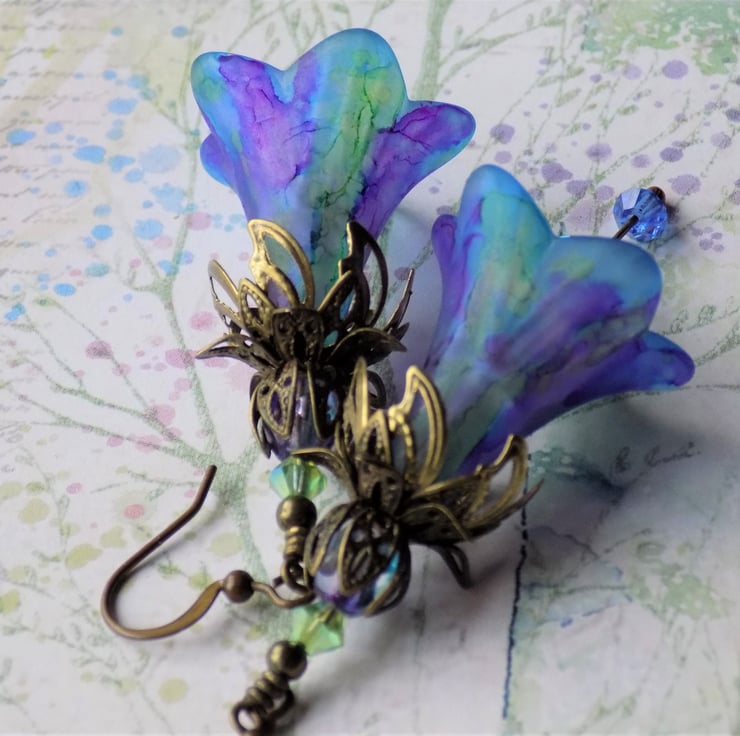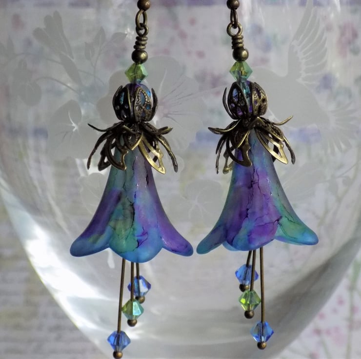 These gorgeous large bellflower earrings have a blue background, with plum, purple and green marbling. They were inspired by some beuatiful irises in flower in our garden. They have filigree antiqued bronze bead caps and 'stamens' of Swarovski Crystal Bicones in matching colours. They are shown with nickel and lead free bronze hooks, but you may choose your desired ear wires from the drop-down menu.