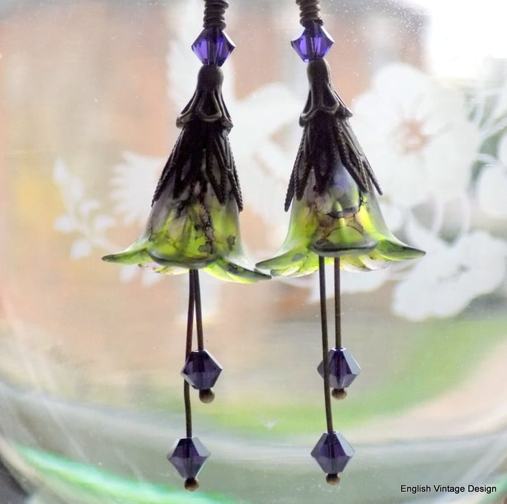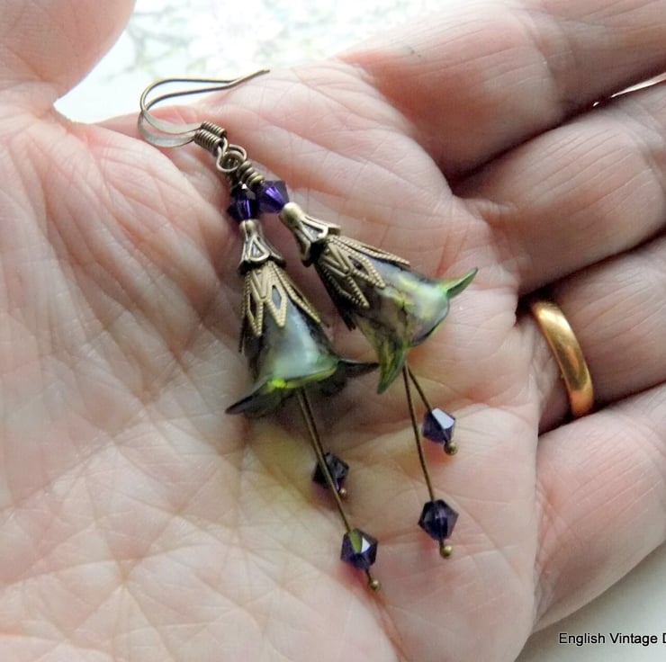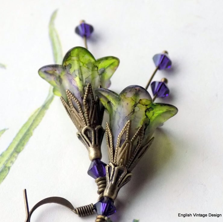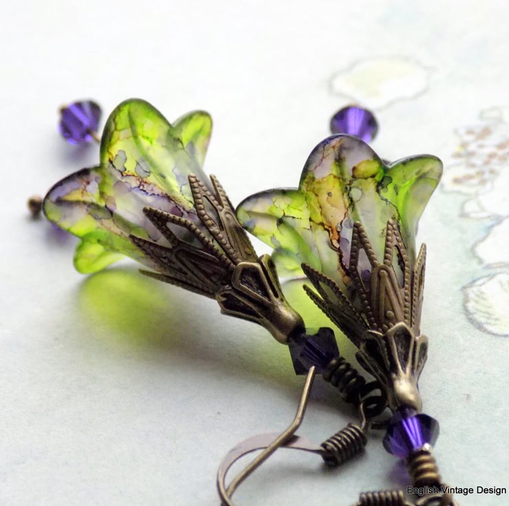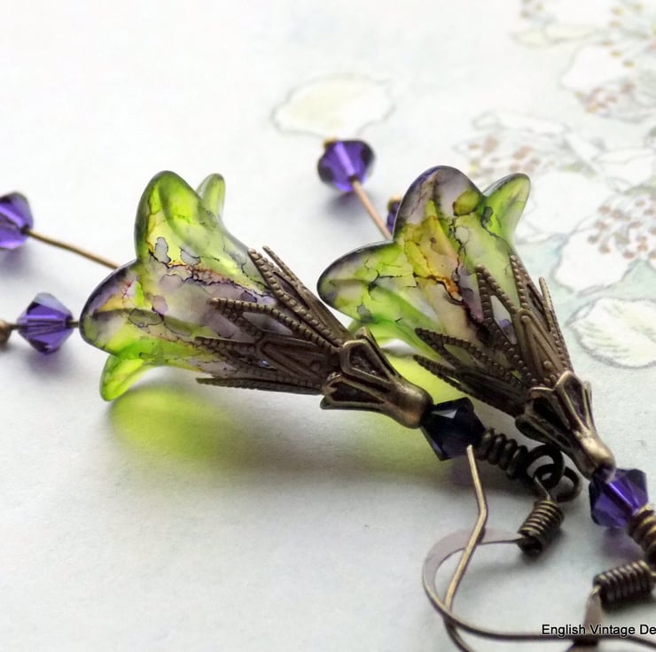 Hand Painted Lucite Small Bell Flower Earrings, exclusive to English Vintage Design, in a gorgeous blend of lime-green, and purple, and featuring Swarovski Crystals and filigree brass bead caps. They are pictured with hooks but you may choose your desired ear wire from the drop-down menu.