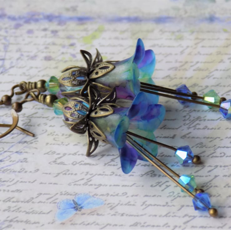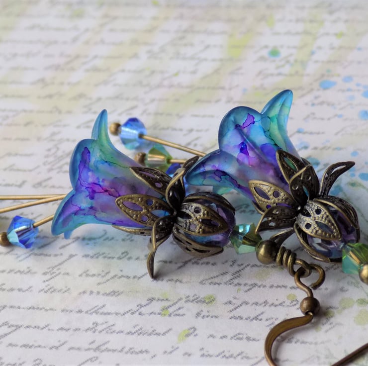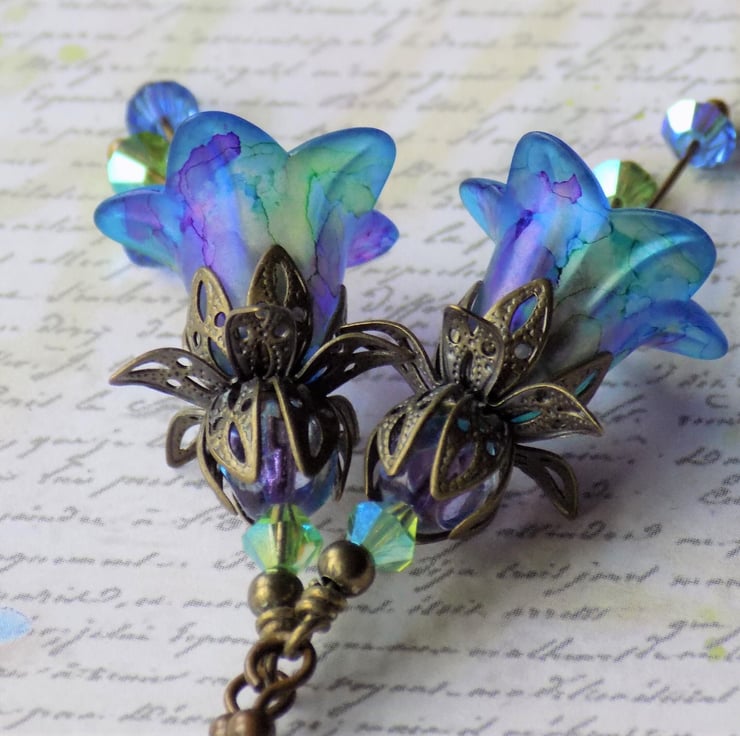 These gorgeous small bellflower earrings have a blue background, with plum, purple and green marbling. They were inspired by some beautiful irises in flower in our garden. They have filigree antiqued bronze bead caps and 'stamens' of Swarovski Crystal Bicones in matching colours. They are shown with nickel and lead free bronze hooks, but you may choose your desired ear wires from the drop-down menu.