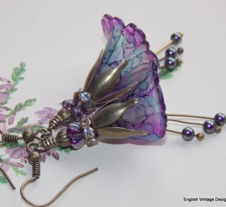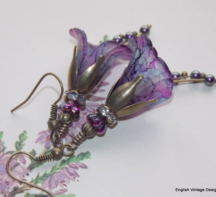 "HEATHER" is exclusive to English Vintage Design; these lovely earrings feature lucite lily flowers in a blend of pale blue, plum and aubergine. They have stamens of 3mm purple Preciosa pearls, with bronze and rhinestone rondelles and little Czech glass flowers, above the antiqued bronze bead caps.