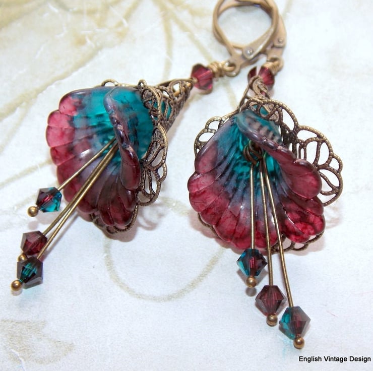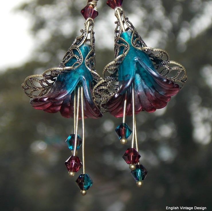 Teal and Burgundy Hand Painted Lucite Lily Flower Earrings, Floral Boho Vintage