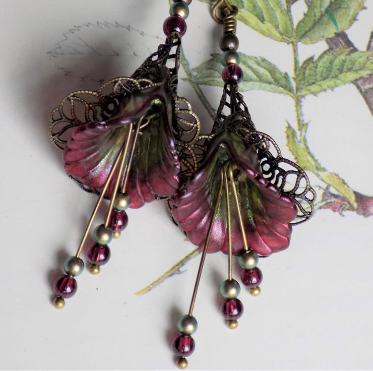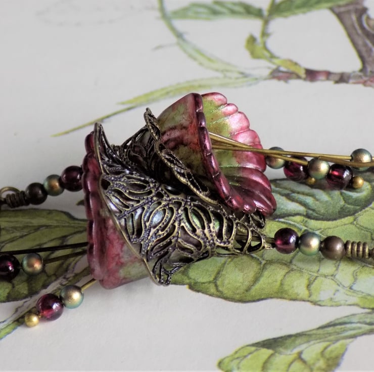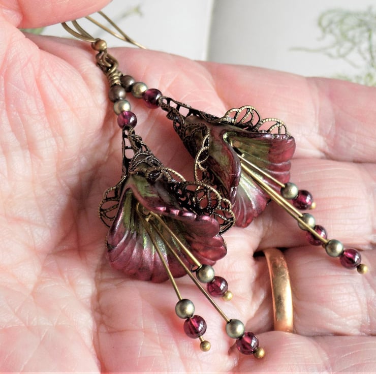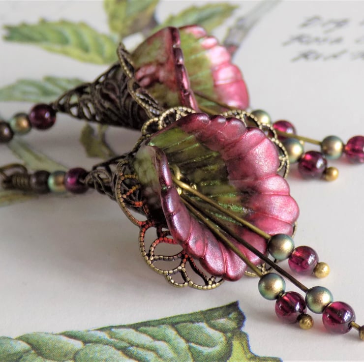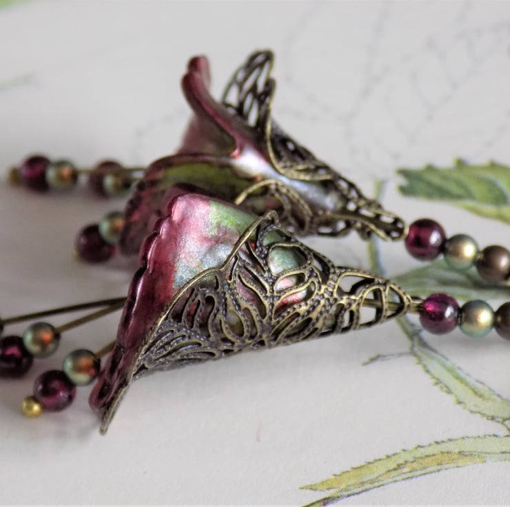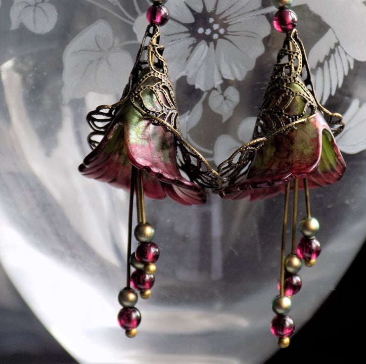 Unique hand painted lucite flower earrings in beautiful shades of pearlescent red and green, surrounded by antiqued bronze filigree. The three dangles have real garnets and iridescent green Swarovski Pearls, which are repeated above the flowers.