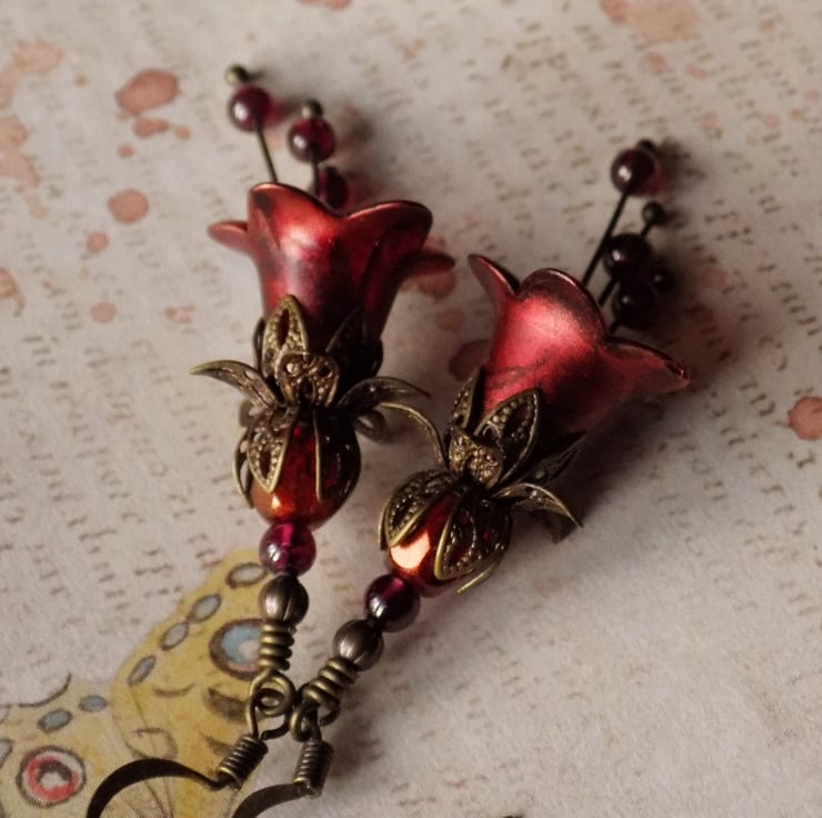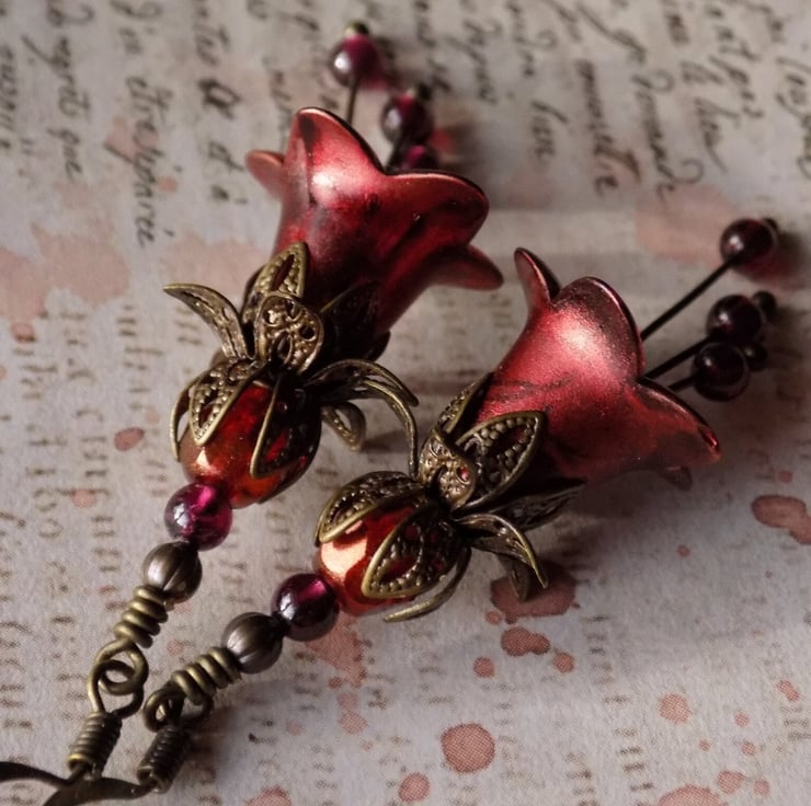'Cranberry Copper' is exclusive to English Vintage Design; these lovely earrings feature my smaller lucite bell flowers in a blend of cranberry red, and copper, and featuring antiqued bronze, double filigree bead caps and stamens of real garnet rounds.
