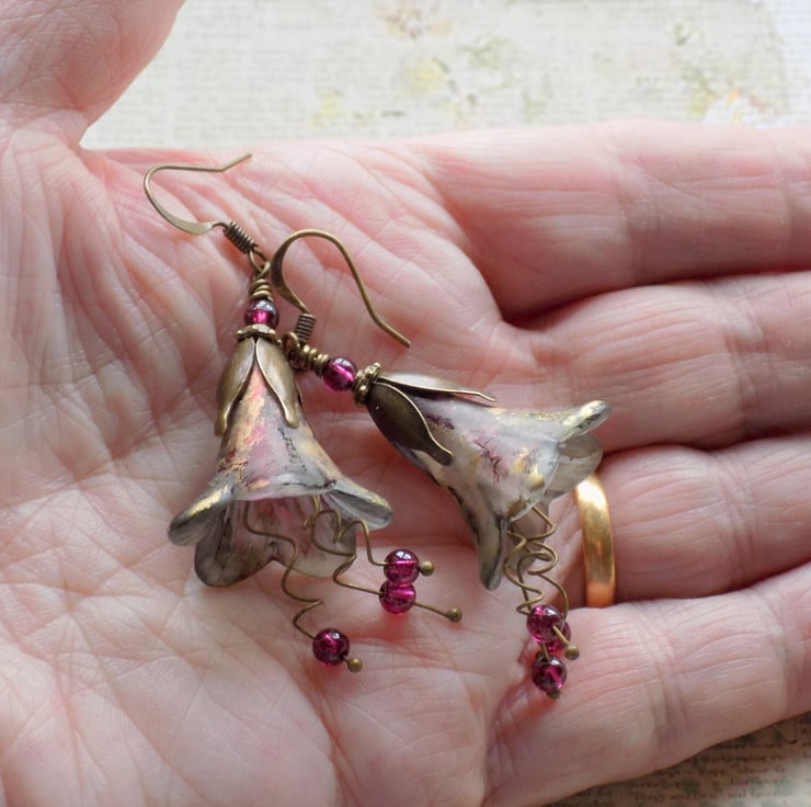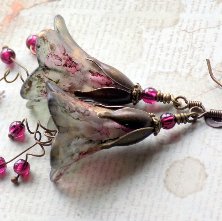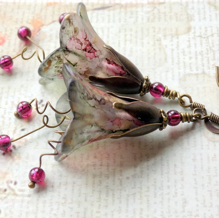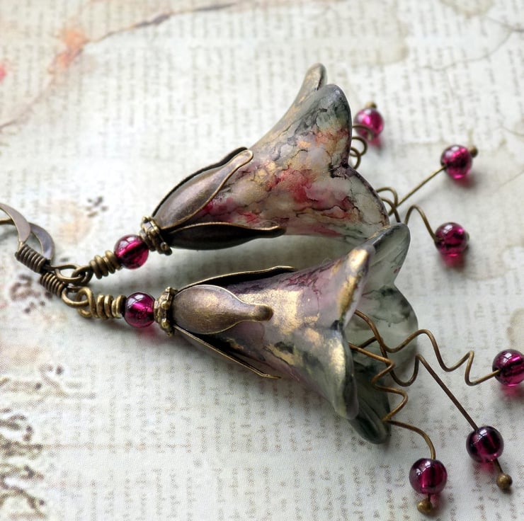 Hand Painted Lucite, Red, Green, Grey and Gold, Flower Earrings, exclusive to English Vintage Design, featuring real garnet dangles. These are my larger bellflower range, which will certainly get you noticed!