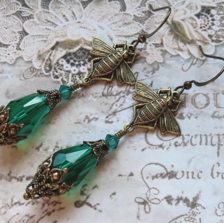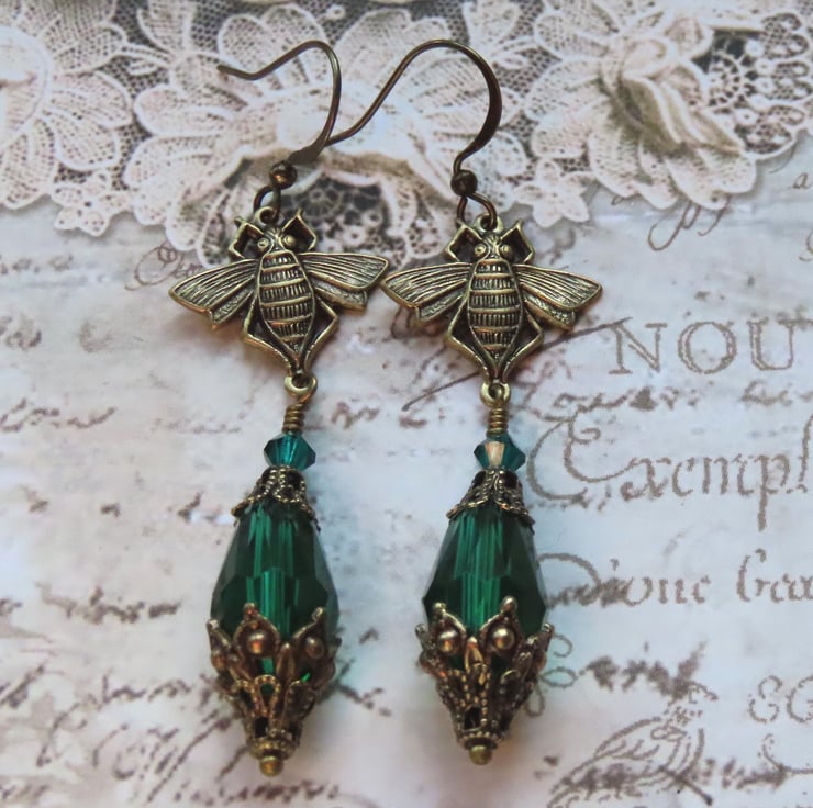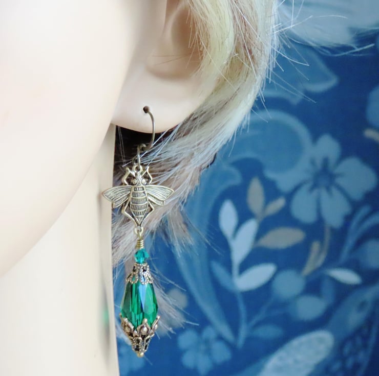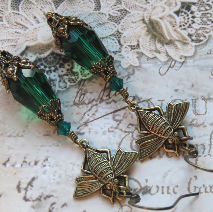 Emerald Green Crystal Dangle Earrings, AntiqueVintage Style Bee Teardrop Earring