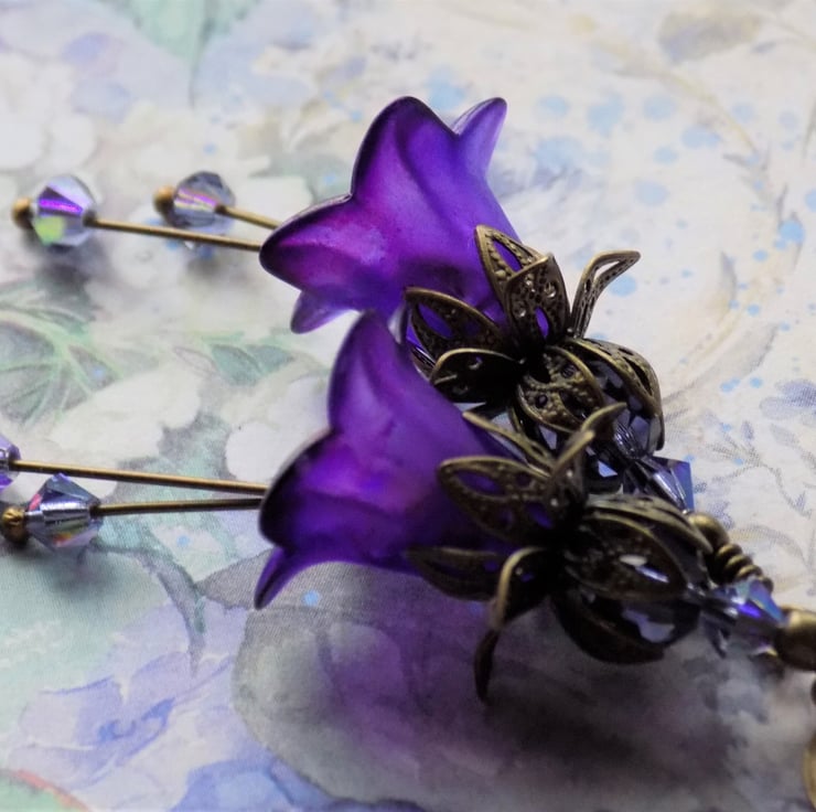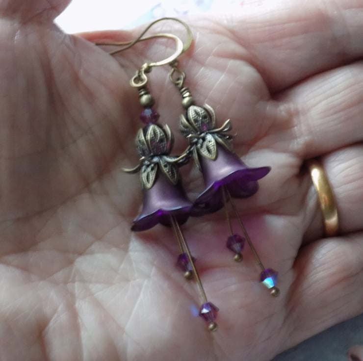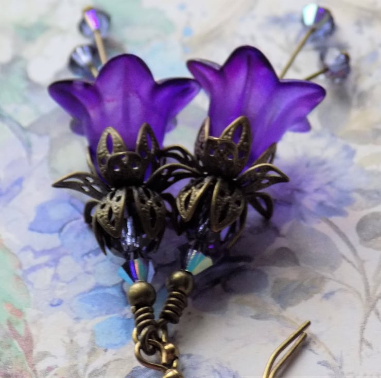 'AMETHYST PURPLE' are exclusive to English Vintage Design; these lovely earrings feature my smaller lucite bell flowers in glowing purple and featuring antiqued bronze, double filigree bead caps and stamens of swarovski crystals in Tanzanite.