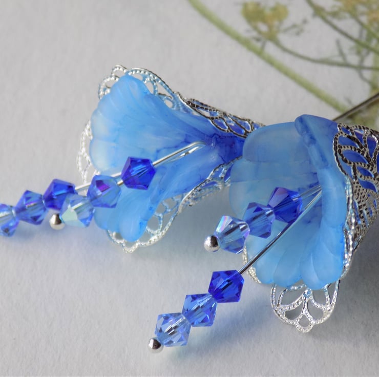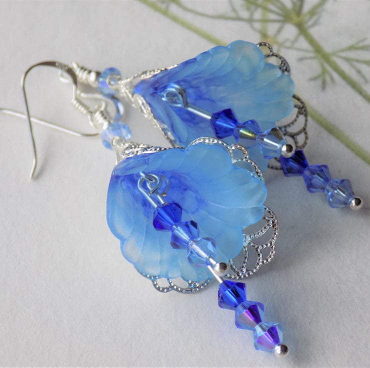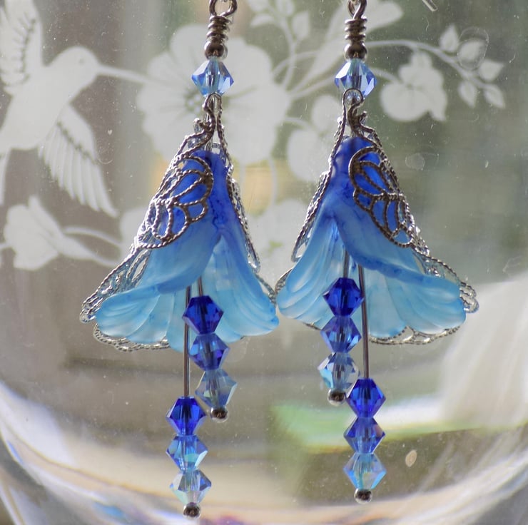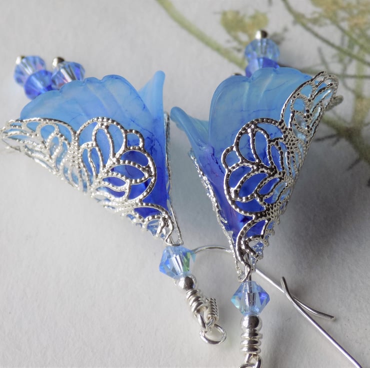 Inspired by some beautiful shades of phlox and comos, in flower at the moment, these lucite lily flowers are hand painted in gorgeous glowing translucent colours and surrounded by lacy filigree silver. They have dangles of three different shades of Swarovski crystals, chosen carefully to tone perfectly with the flower colours.
