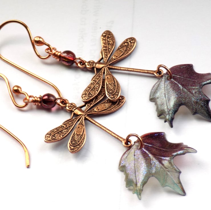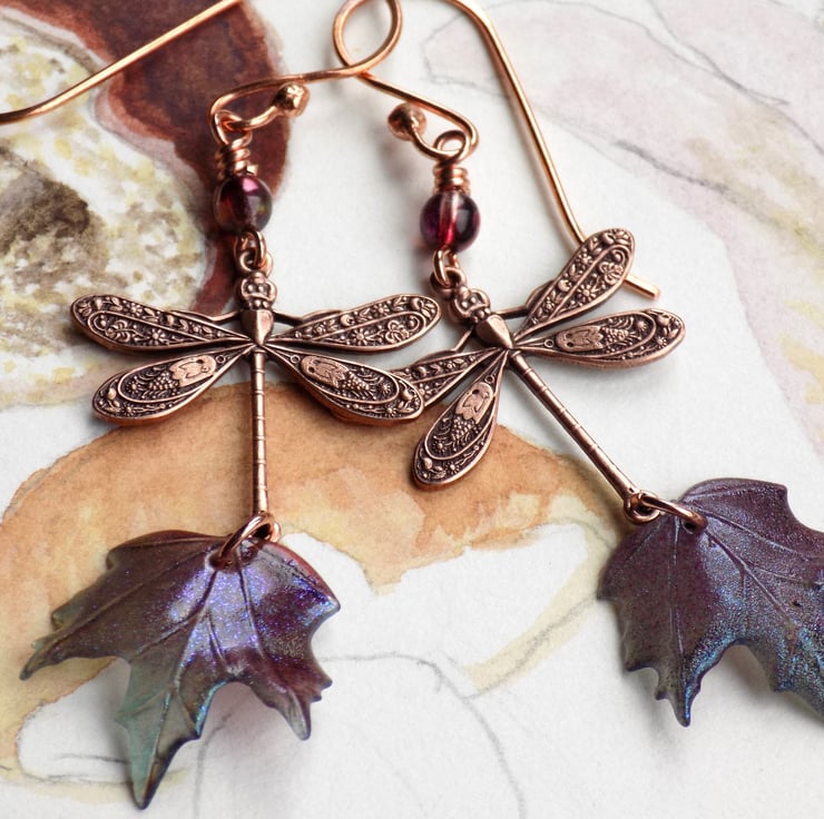 These lovely long dangle hand painted lucite maple leaf earrings are exclusive to English Vintage Design. The hand painted leaves vary in colour, and will all be slightly different to the ones pictured. They dangle from beautifully detailed 23.5x24mm copper dragonflies, with little Czech glass beads sitting above. The full length is 2.75in from top of hook to bottom of the leaf. They have handmade solid copper hooks.