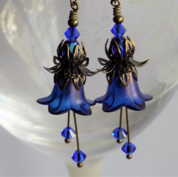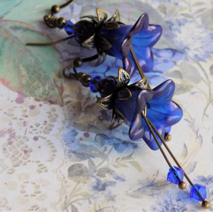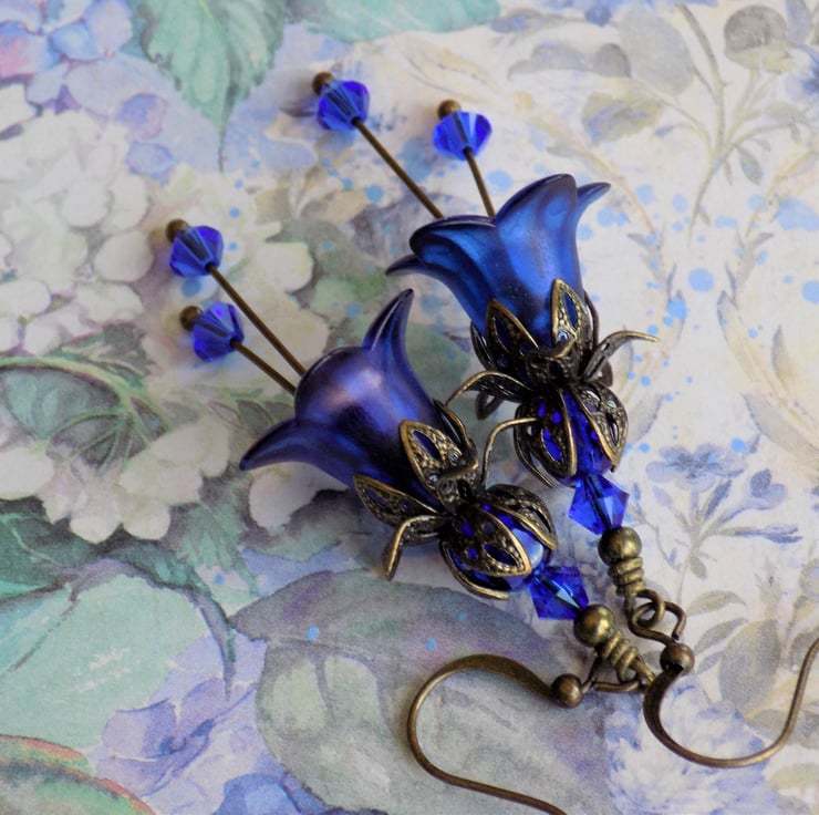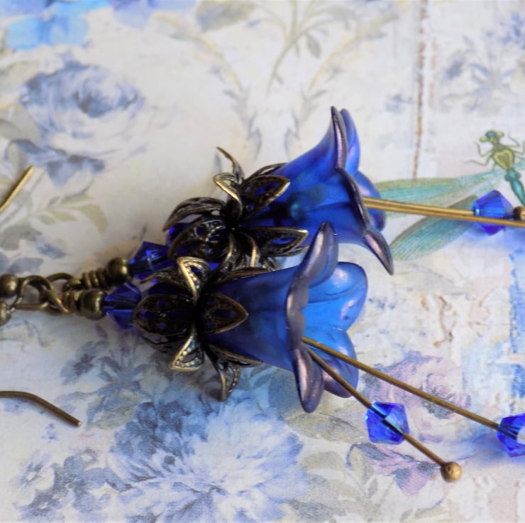 'MAJESTIC BLUE' is exclusive to English Vintage Design; these lovely earrings feature my smaller lucite bell flowers in glowing Royal Blue and featuring antiqued bronze, double filigree bead caps and stamens of swarovski crystals in Majestic Blue. They really are very cute and extremely lightweight to wear.