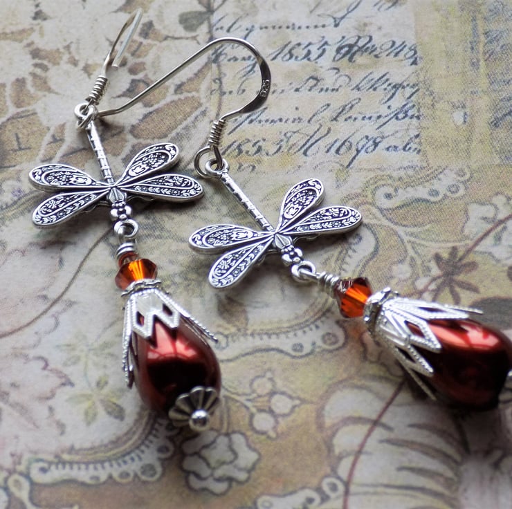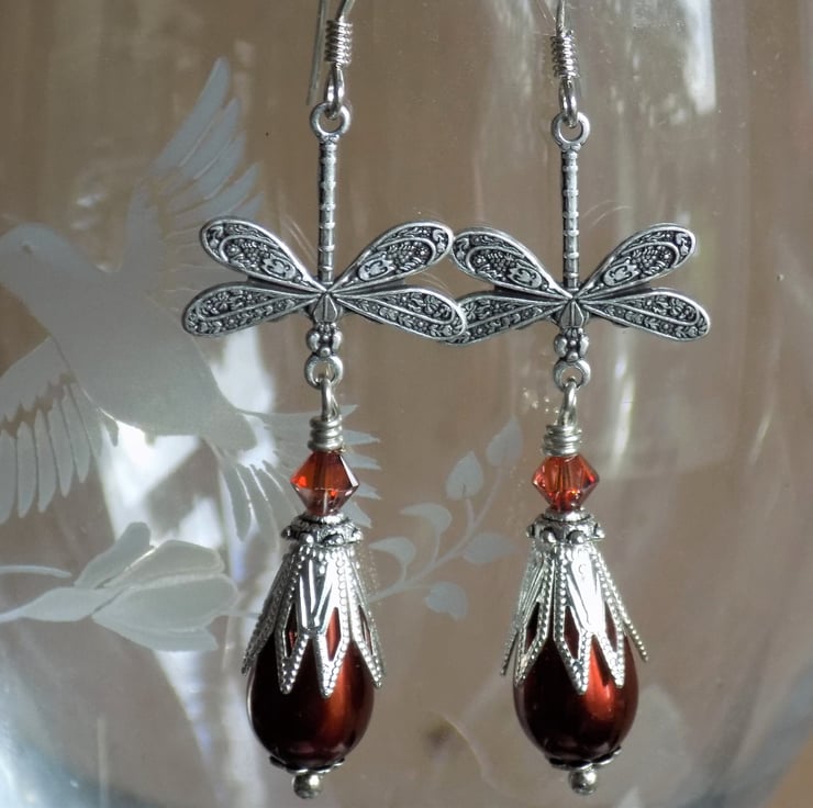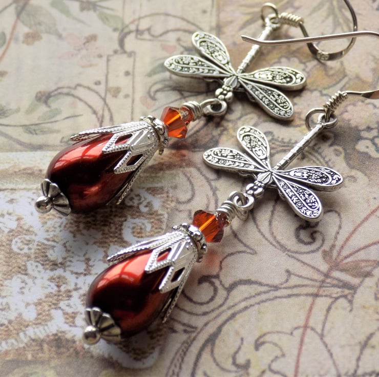 Art NouveauVictorian style dangle earrings featuring Preciosa Pearl drops in a lovely Coppery Red, adorned with beautifully detailed antiqued silver bead caps and topped with matching Swarovski crystal bicones. These dangle from detailed antiqued silver dragonflies.