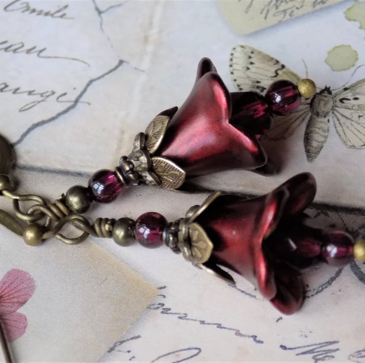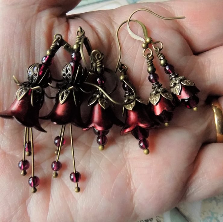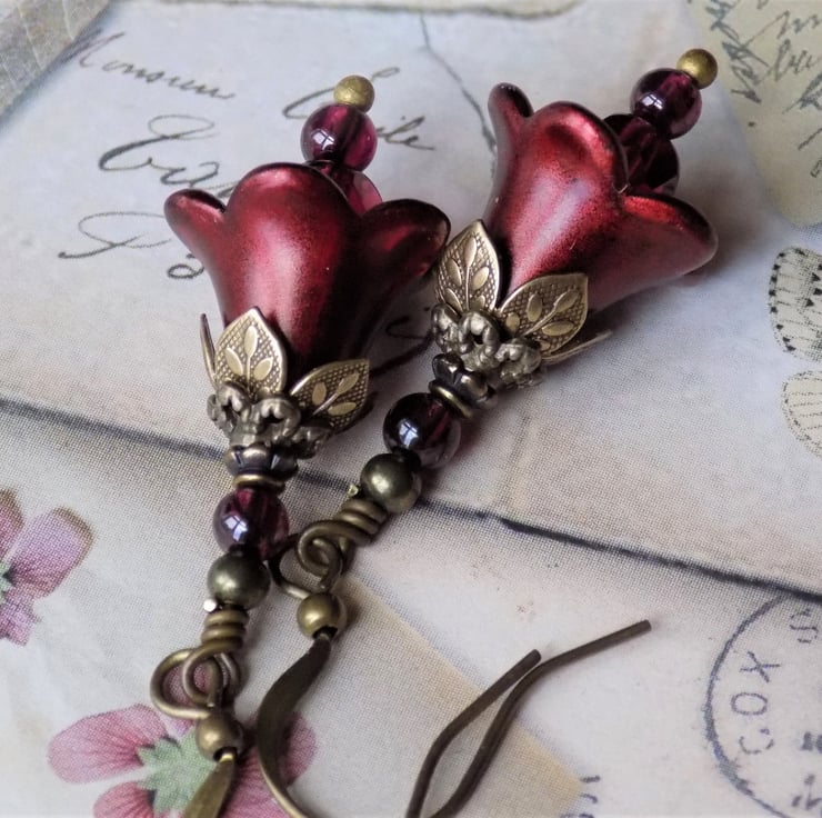 "Cranberry Copper" is one of my best sellers in the small bell flower earrings. These cute little "Fairy Bells" version are just as pretty, but much smaller. They have cranberry Czech glass rounds sitting inside the cups and lovely layed antiqued brass bead caps and real garnets rounds sitting above. I have shown them with brass hooks, but you may choose your desired ear wires from the drop down menu.
