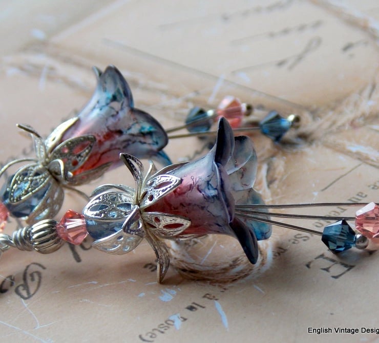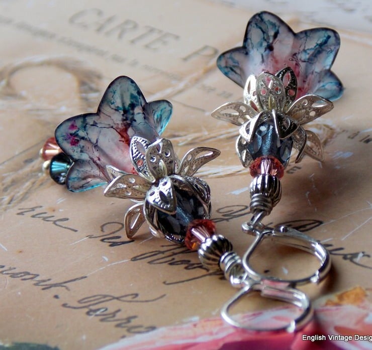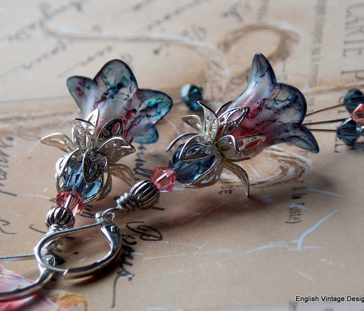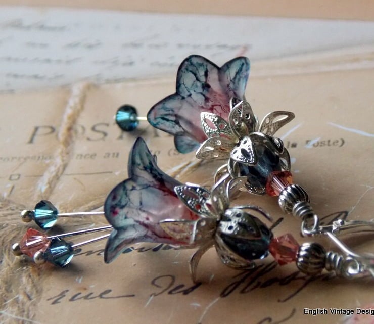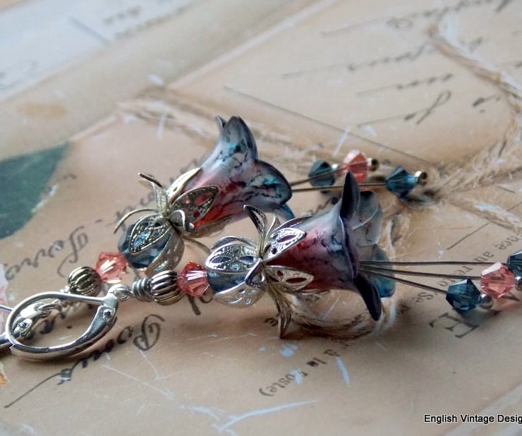 'Montana Peach' is exclusive to English Vintage Design; these lovely earrings feature my smaller lucite bell flowers in a blend of Montana Blue, and peachy pink, and featuring antiqued silver, double filigree bead caps and stamens of Swarovski Crystals.