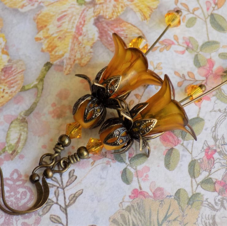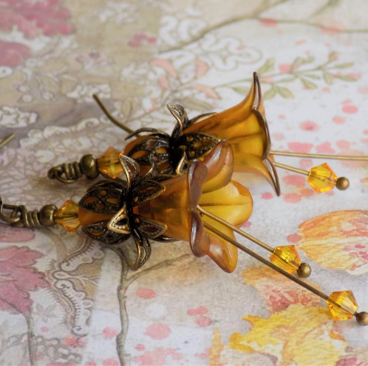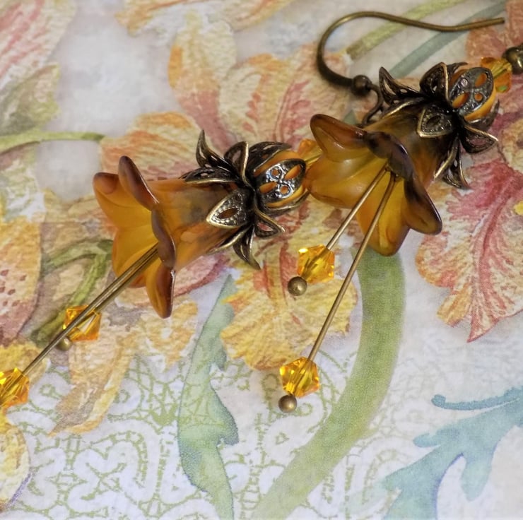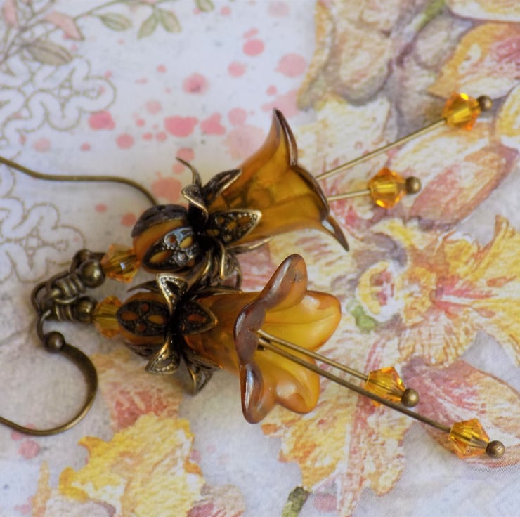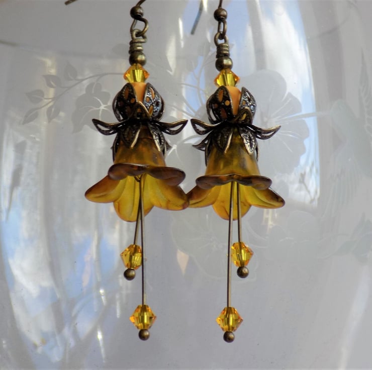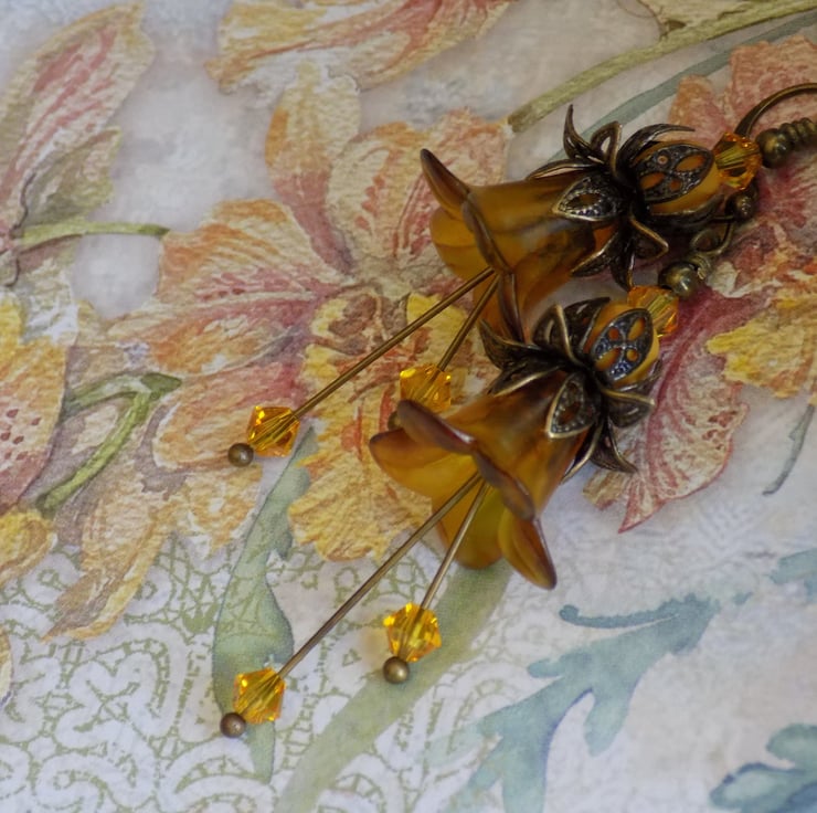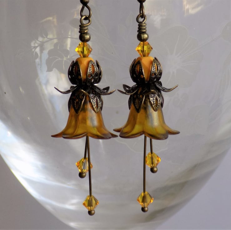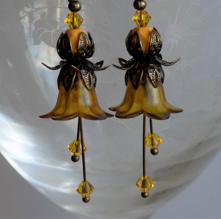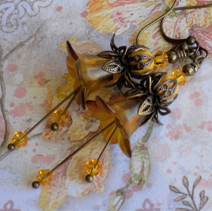 'DIJON MUSTARD' is exclusive to English Vintage Design; these lovely earrings feature my smaller lucite bell flowers in glowing but subtle mustard yellow and featuring antiqued bronze, double filigree bead caps and stamens of swarovski crystals in topaz yellow. They really are very cute and extremely lightweight to wear.