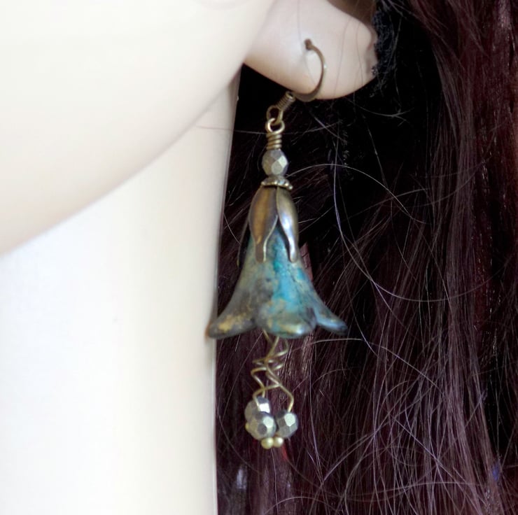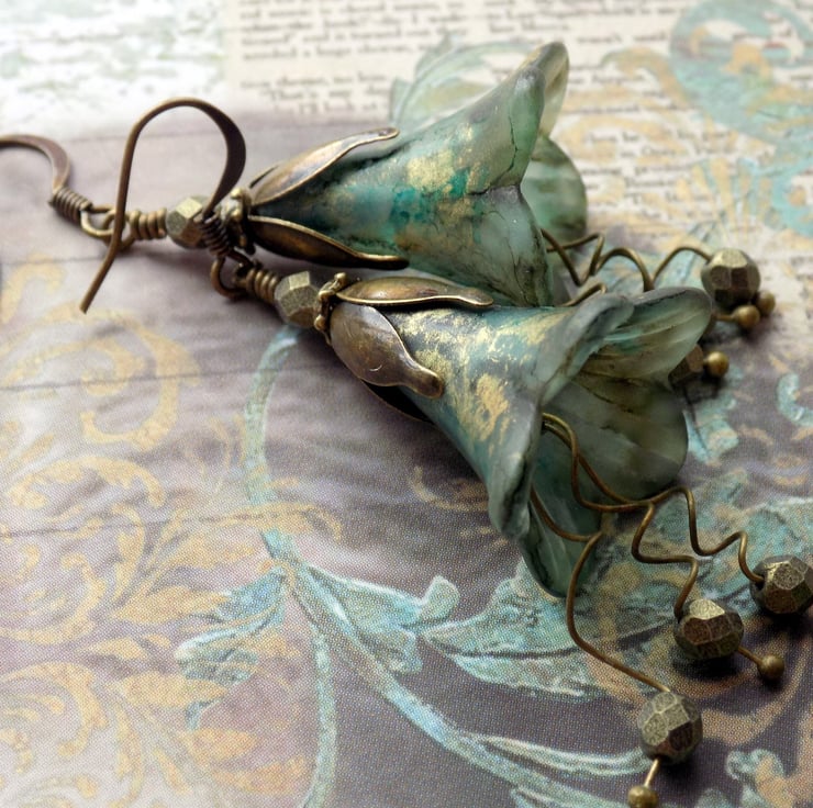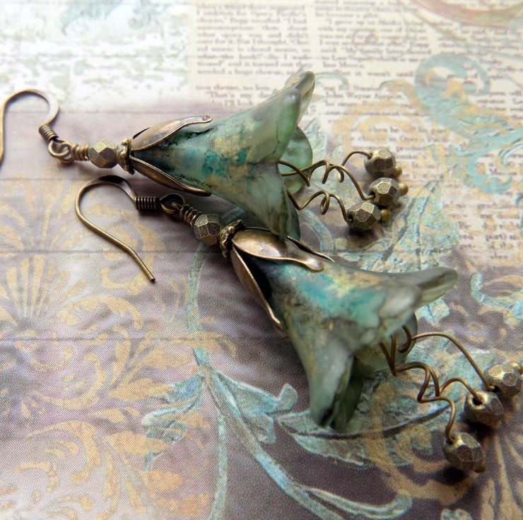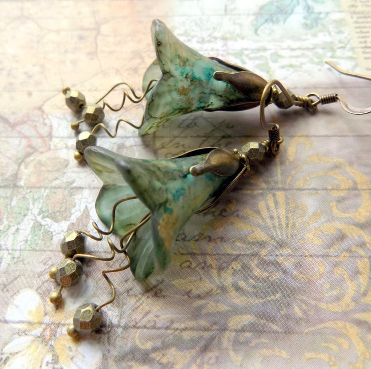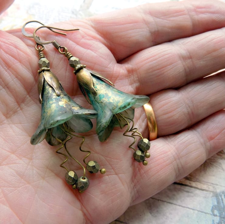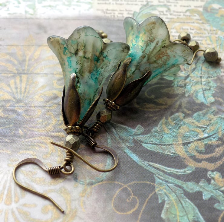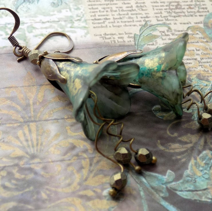 Hand Painted Lucite, Green, Turquoise, and Gold Flower Earrings, exclusive to English Vintage Design, featuring hand twisted stamens with Czech Glass beads and antiqued brass bead caps. These are my larger bellflower range, which will certainly get you noticed!