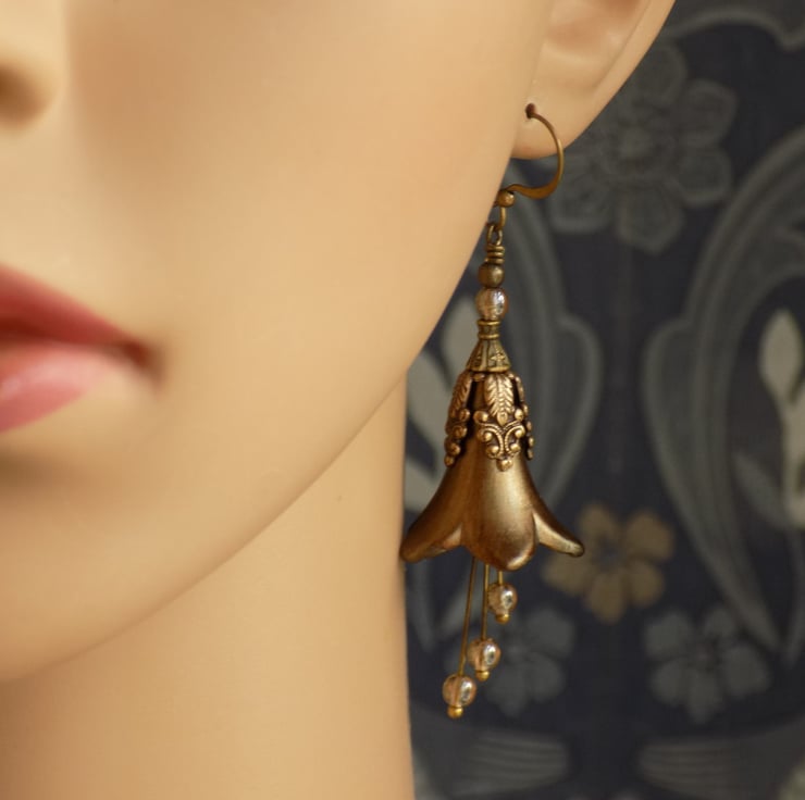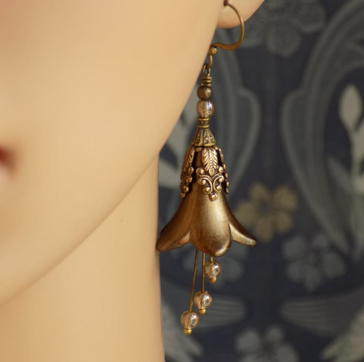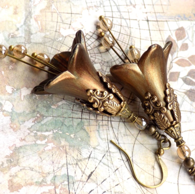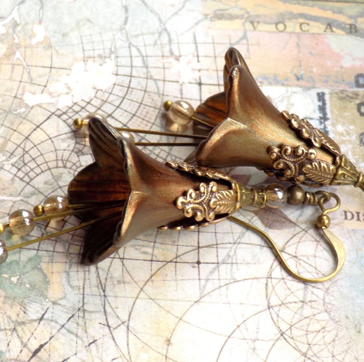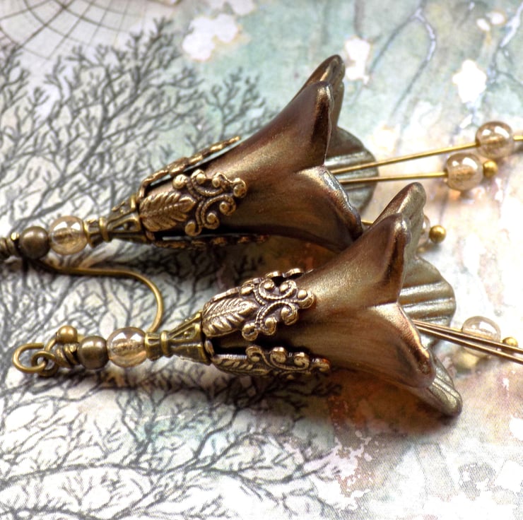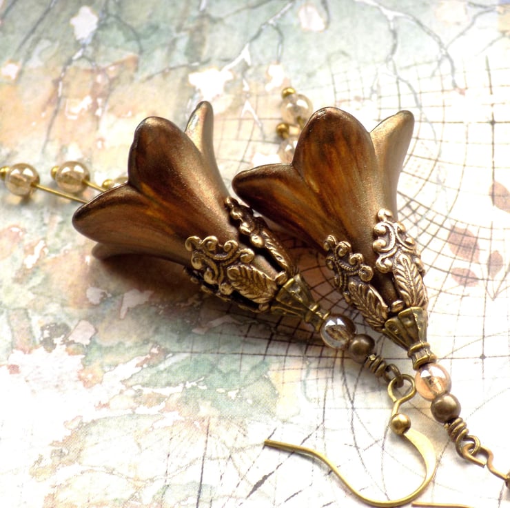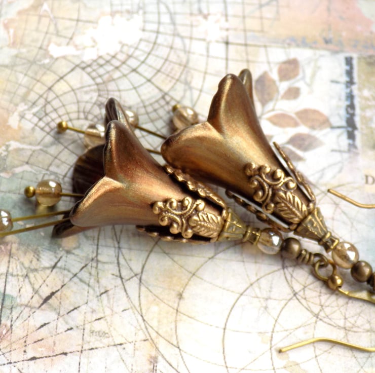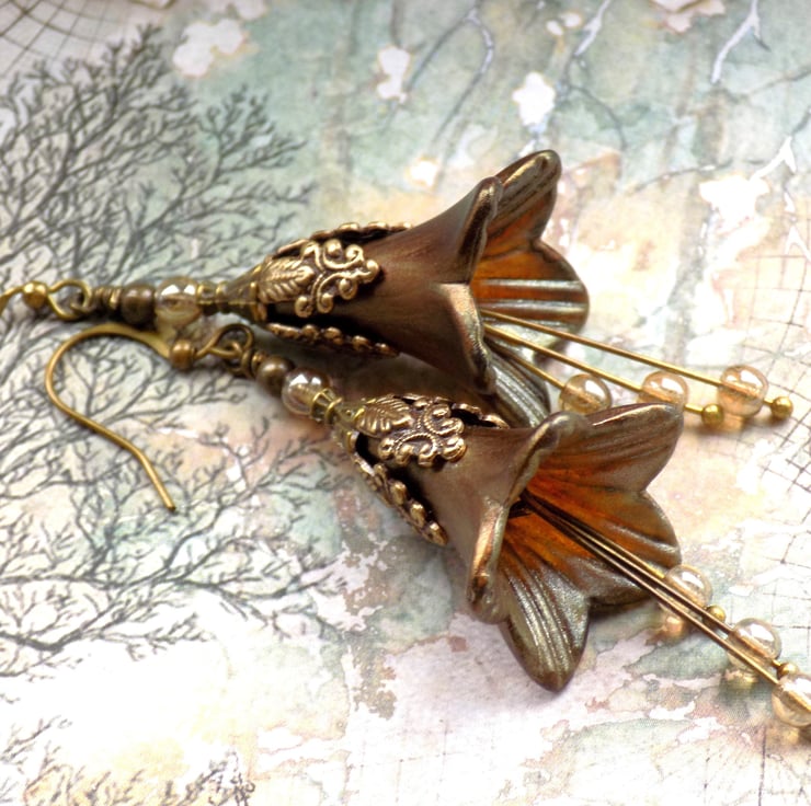 I have painted these gorgeous lucite earrings in glowing golden brown with a subtle sheen. They are adorned with antiqued brass ornate bead caps and 4mm Czech glass beads of light colorado topaz lustre swing from inside the flowers.