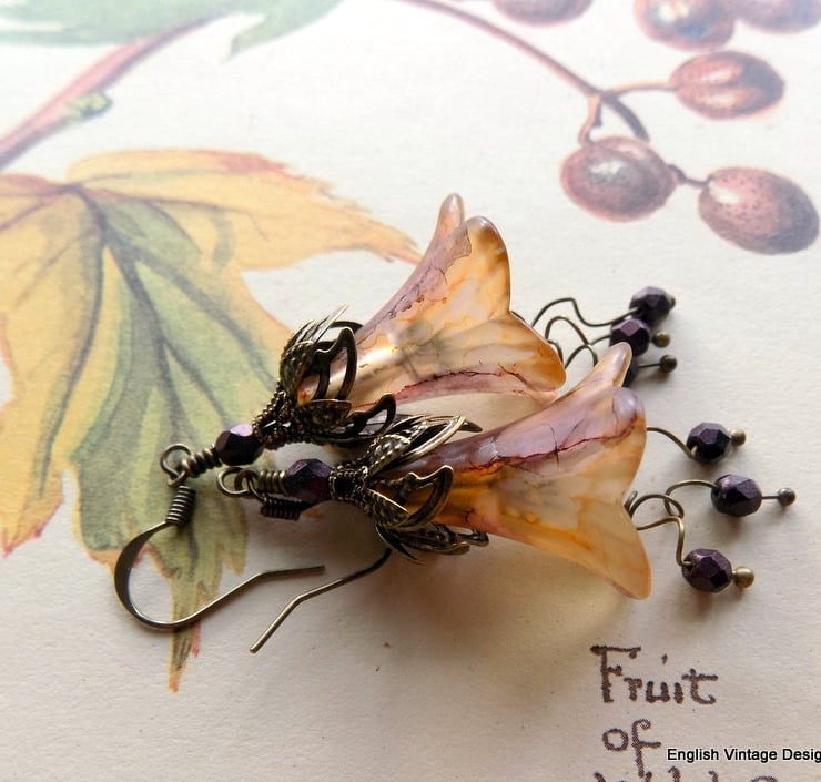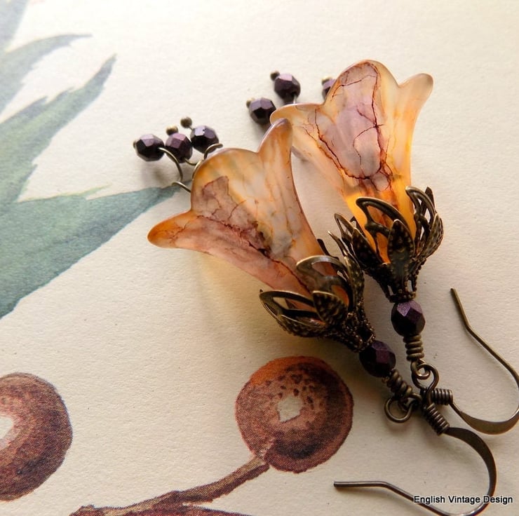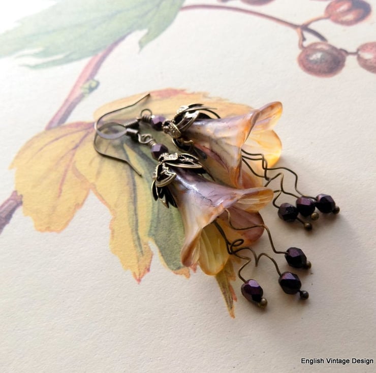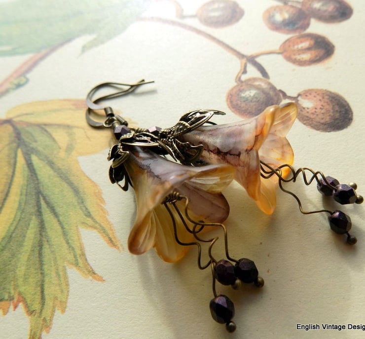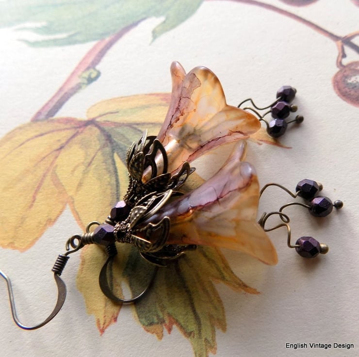 'Greengage' are exclusive to English Vintage Design; these lovely earrings feature my larger lucite bell flowers in a blend of yellow and dark red-purple, with layered antiqued bronze, filigree bead caps and hand twisted stamens of Czech Glass rounds.