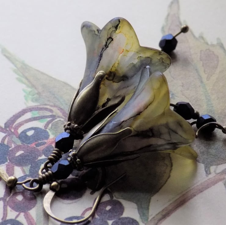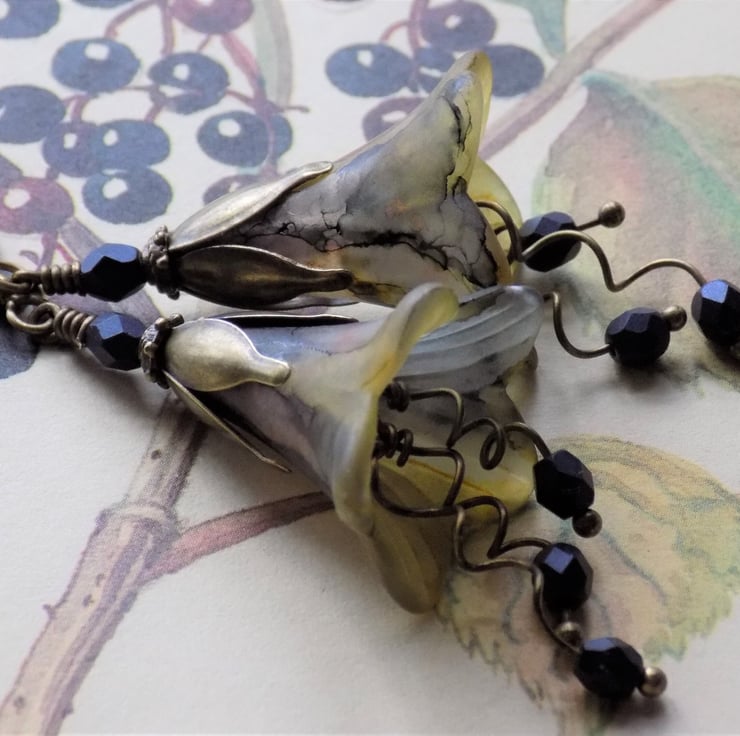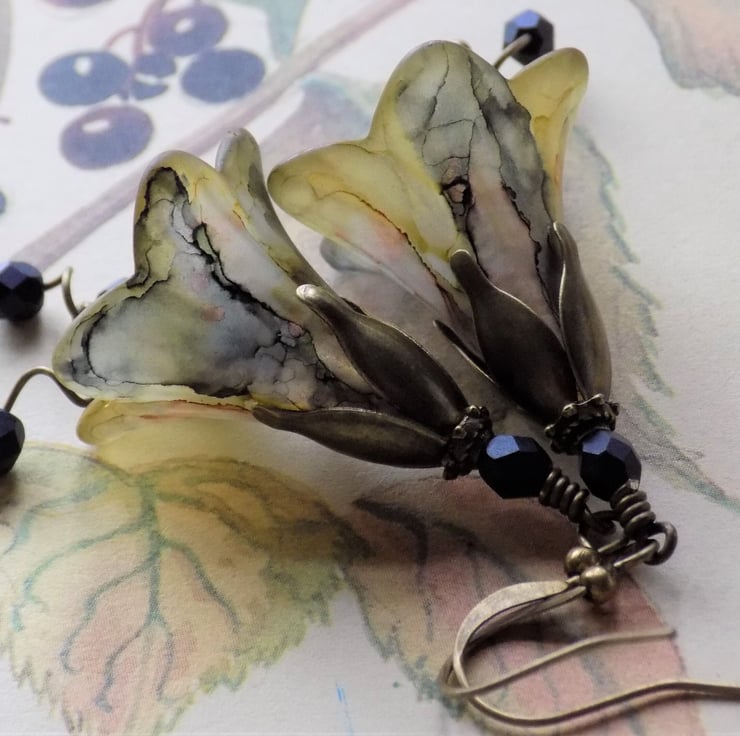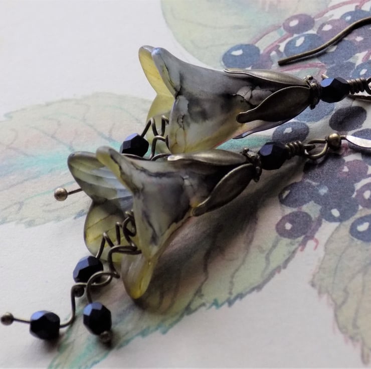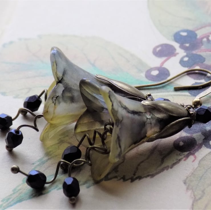 'Elderberry' are one of 7 new autumn themed earrings exclusive to English Vintage Design; these lovely earrings feature my larger lucite bell flowers in a blend of light olive green and black, and the merest hint of red, representing the autumn leaves and fruits of the elder tree, often seen in the hedgerows at this time of year. Three hand twisted 'stamens' dangle below, with Czech glass rounds in darkest navy blue, which also sit above the antique bronze bead caps.
