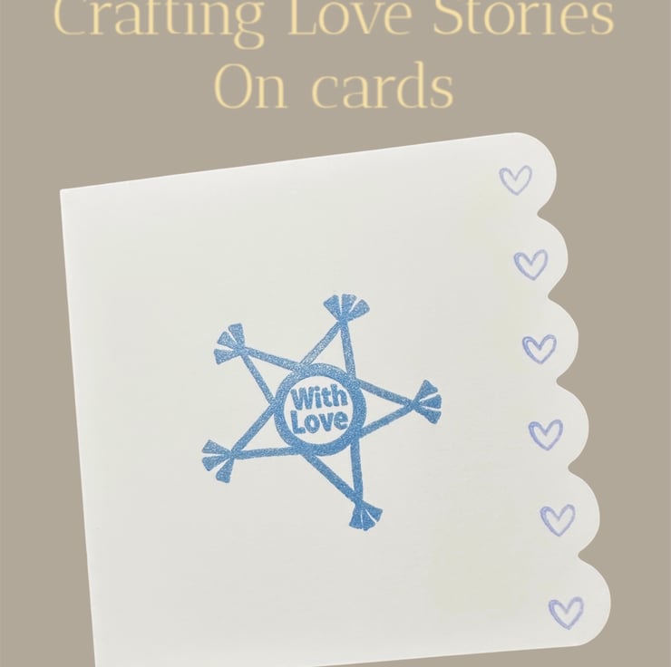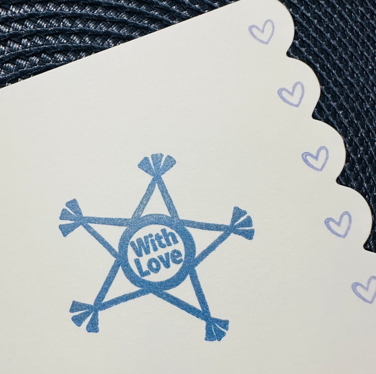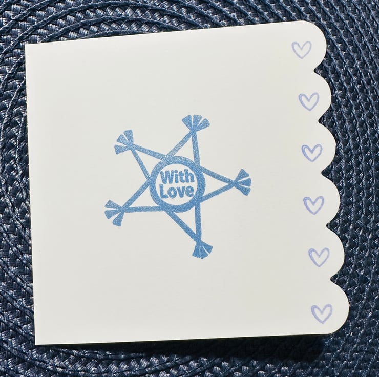 A blue star with the sentiment “with love” sits on a quality, heavy, acid free white card with a scalloped edge decorated with hearts. The denim blue ink used has a slight shimmer to it.